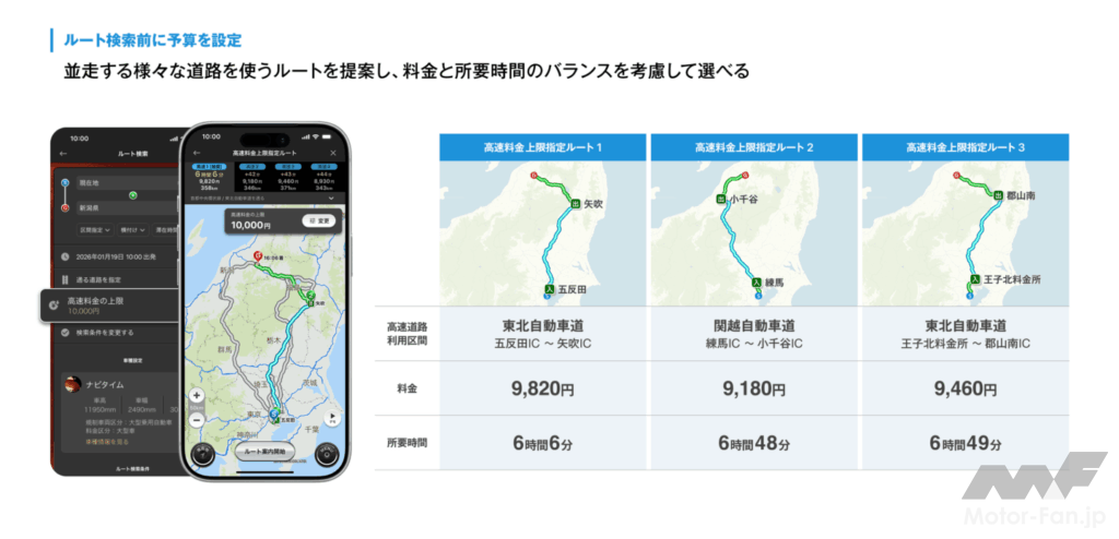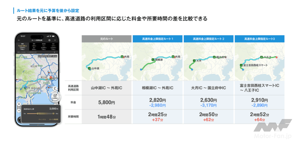 これは高速道路を利用するルートを検索する際にユーザーが設定した金額内でのルートを提案するもの。あらかじめ予算が決まっている場合には検索前に、通常料金を確認してから調整したい場合は検索後に利用ができる。さまざまなパターンのルートを最大6種類まで提案する。