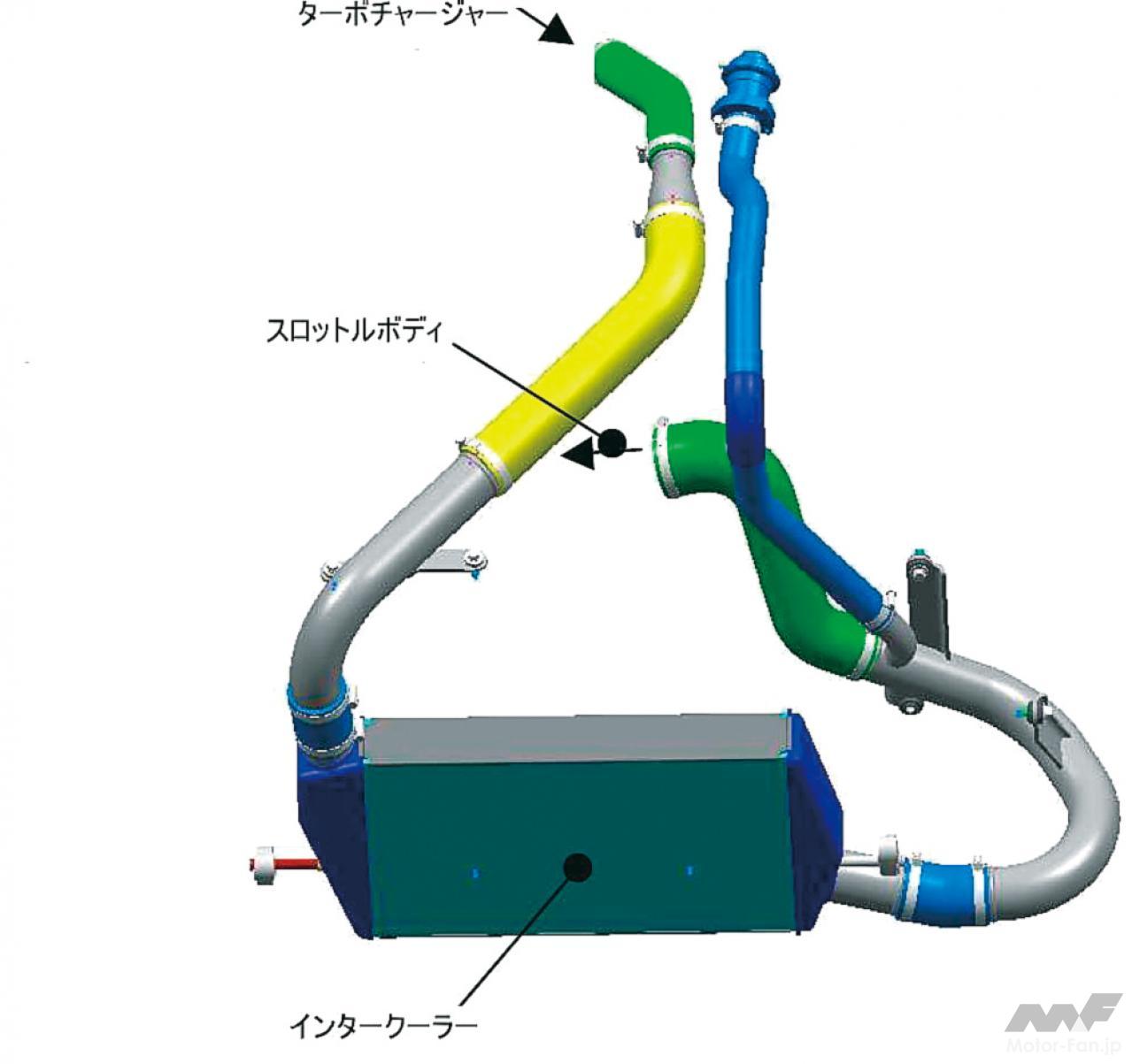 ターボチャージャーはランサーエボリューションIV以来のツインスクロール式を採用。1番と4番、2番と3番のエキゾーストマニホールドを組み合わせ、それぞれを別のスクロールに導く。こうすることで、排気干渉を回避。エンジン回転が低い領域から効率良くタービンを回転させられる。作りにくい素材なうえに間仕切りが入るため高価。レスポンス向上をターゲットに、A/Rの最適化やブレードの形状変更など、細かな改良を積み重ねている。高回転狙いではないので、大型タービンは不要。