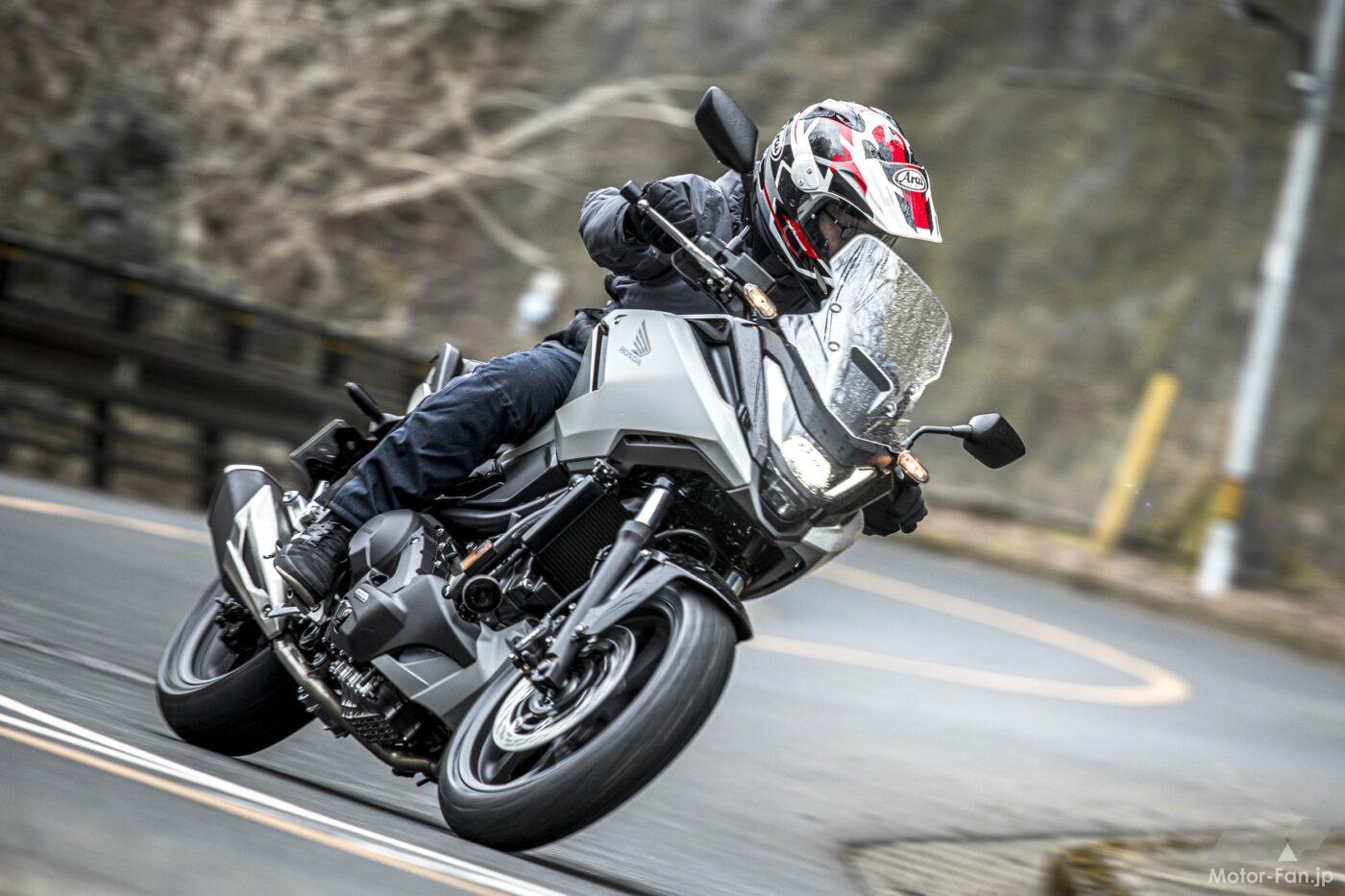 ハンドリングは、やや特殊というか特徴的と言えるかもしれない。起き上がり小法師のように車体が直立しようという働きが強く、フロントホイールが先行して内側を向きたがるからだ。最初はタイヤの内圧不足を疑ったが、前後ともメーカーの指定どおりだった。ここでふと過去の記憶が蘇る。そう言えば自分のNC750Sもそうだったなと。切れ込むと表現するほどではないが、峠道では上半身を早めに内側へ入れると気持ち良くコーナーを旋回できた。また、このハンドリングには街中で車体をあまり倒さずに曲がれるというメリットもある。