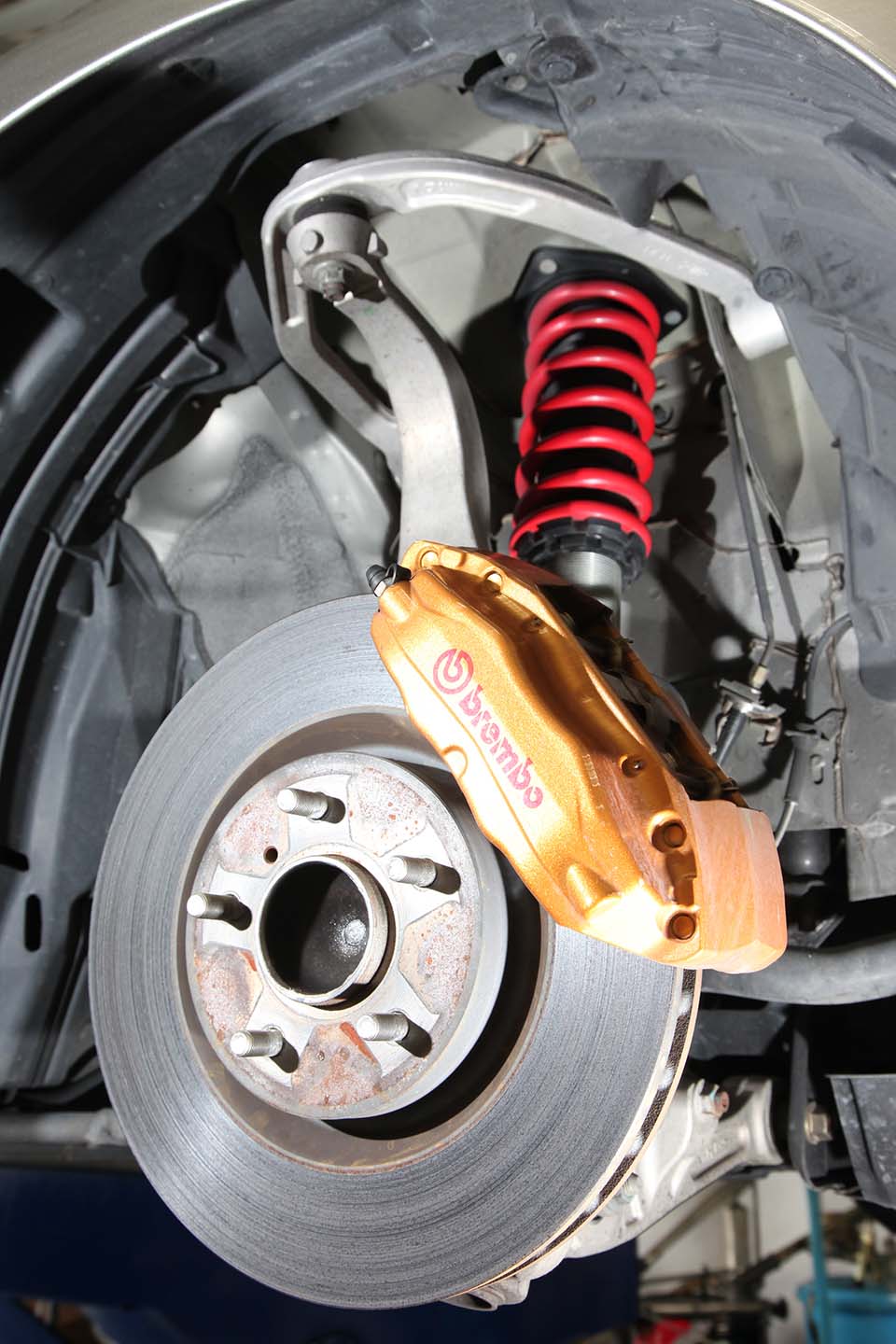 ブレーキは前後ともバージョンT純正ブレンボキャリパー&大径ローターに交換して容量アップ。パッドはエンドレス製を組み、制動性能とコントロール性をさらに高める。足回りにセットされるのはHKSハイパーマックス車高調。