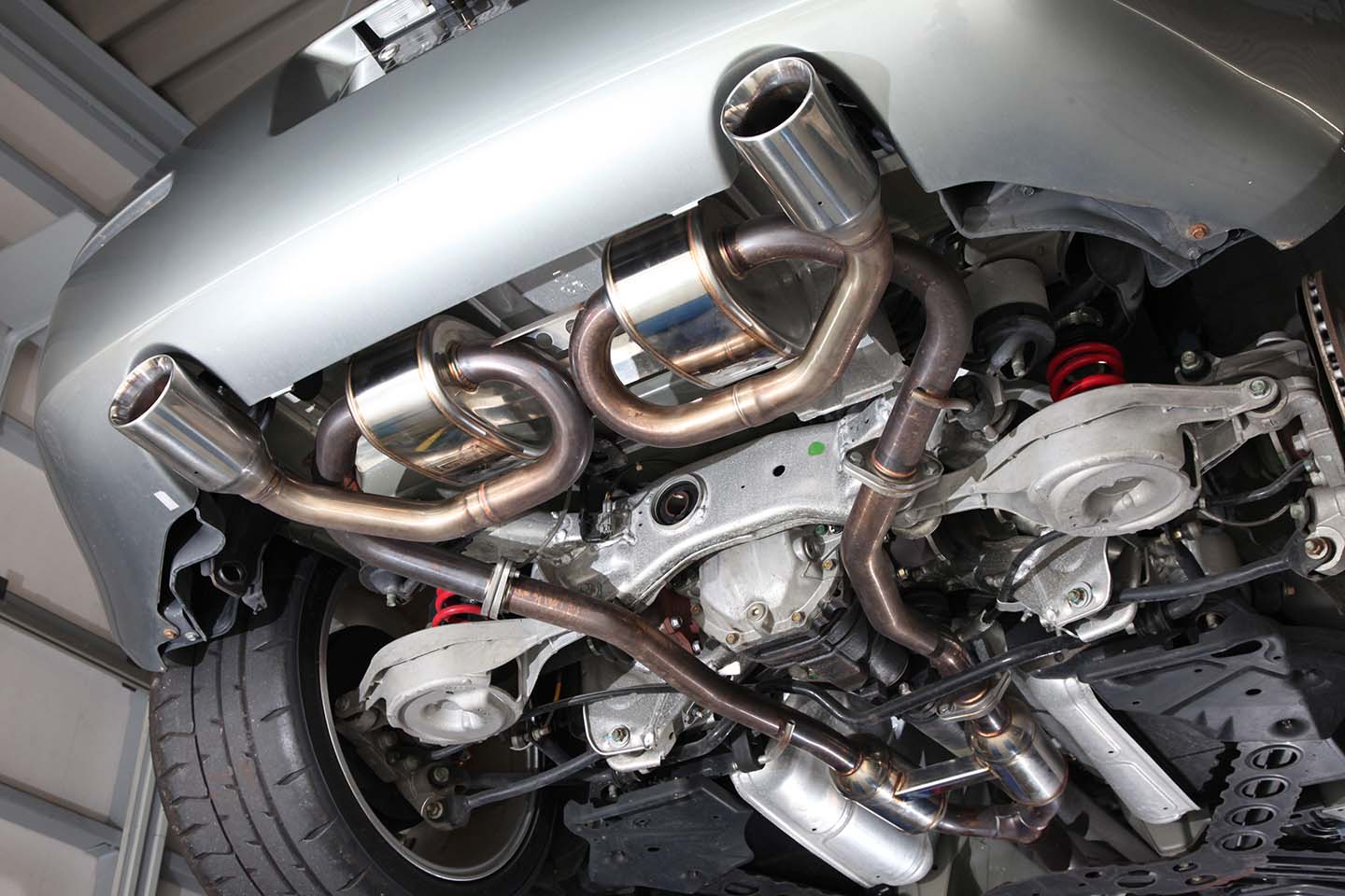 排気系はメタルキャタライザー、センターパイプ、スーパーサウンドマスターマフラーとHKSで統一。マフラーはメインパイプ径65φ→50φ×2、テール径102φ左右シングル出しとなる。「この組み合わせだと、いい音がするんですよね」と北林さん。