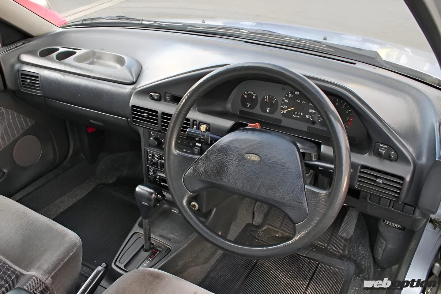 取材車両は、ほぼスクエアストロークでSOHCながら4バルブヘッドが与えられたSOHC版B5型を載せる1500GHIAの4速ATモデル。カムカバーにはフォードの刻印が入り、ファミリアとの差別化が図られる。燃料供給は電子制御キャブレターが担当。同じB5型でもDOHC仕様は電子制御噴射装置(EGI)になるのが大きな違いだ。