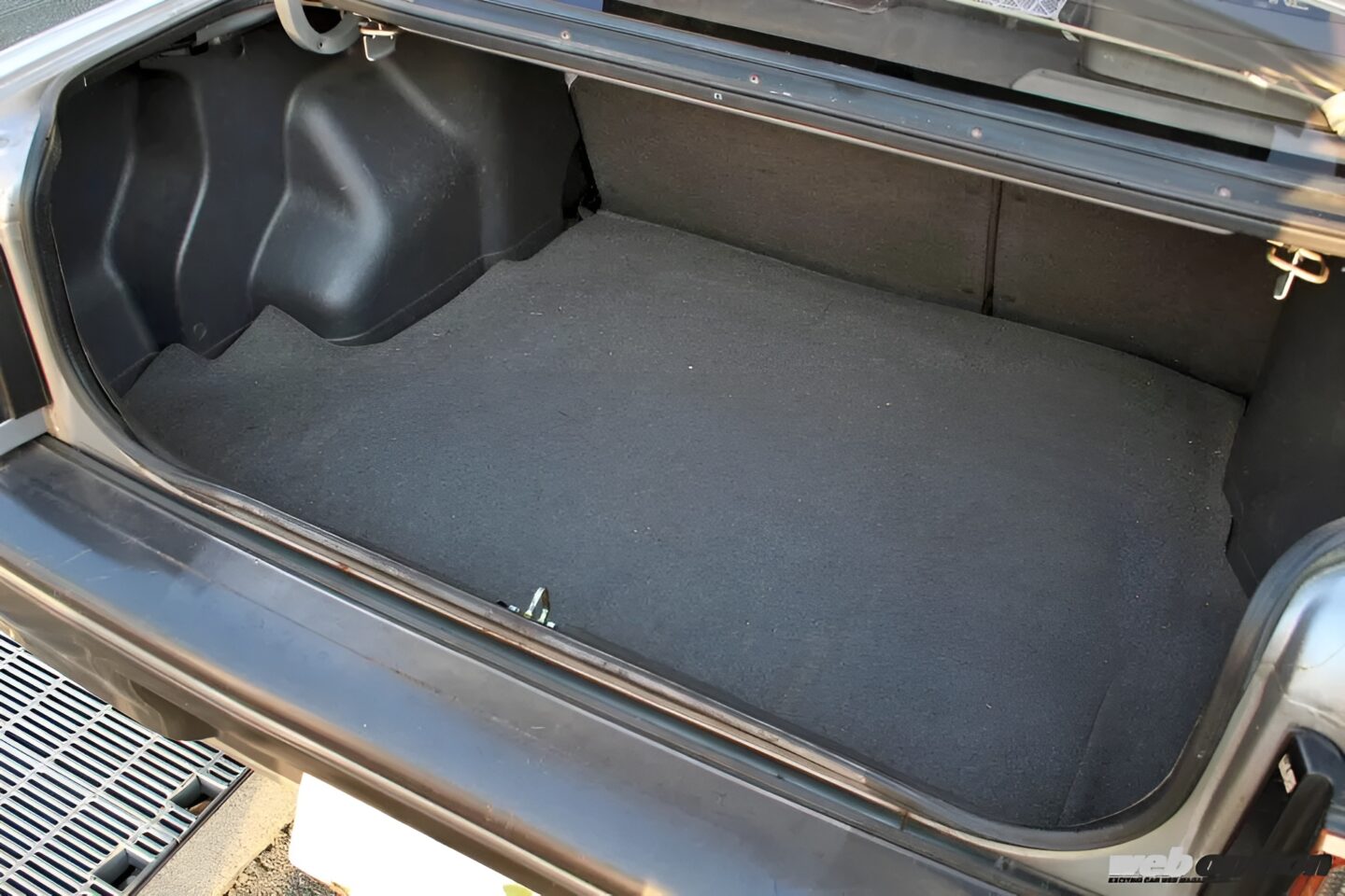 センターコンソールは上からデジタル式時計とリヤデフォッガースイッチ、エアコン吹き出し口、エアコン操作パネル、2DINオーディオ、シガーライター&灰皿。オーディオは標準AM/FM電子チューナー+2スピーカーに対して、取材車両はオプションのカセット付きAM/FM電子チューナー+CDプレイヤーを装着。ちなみに4ドアセダンはアルパイン製、3ドアクーペはパイオニア製となる。