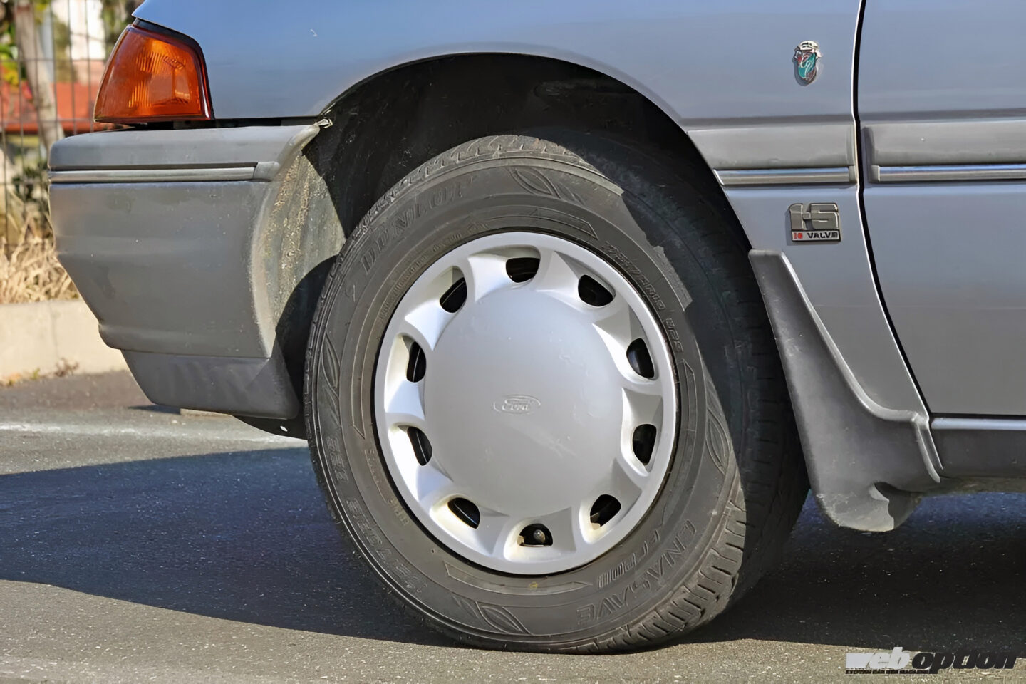 純正13インチスチールホイールにフルキャップを装着。タイヤは標準175/70R13サイズのエナセーブEC202が組み合わされる。また、フロントフェンダー後端にはGHIAと1.5 16バルブのエンブレムが取り付けられる。