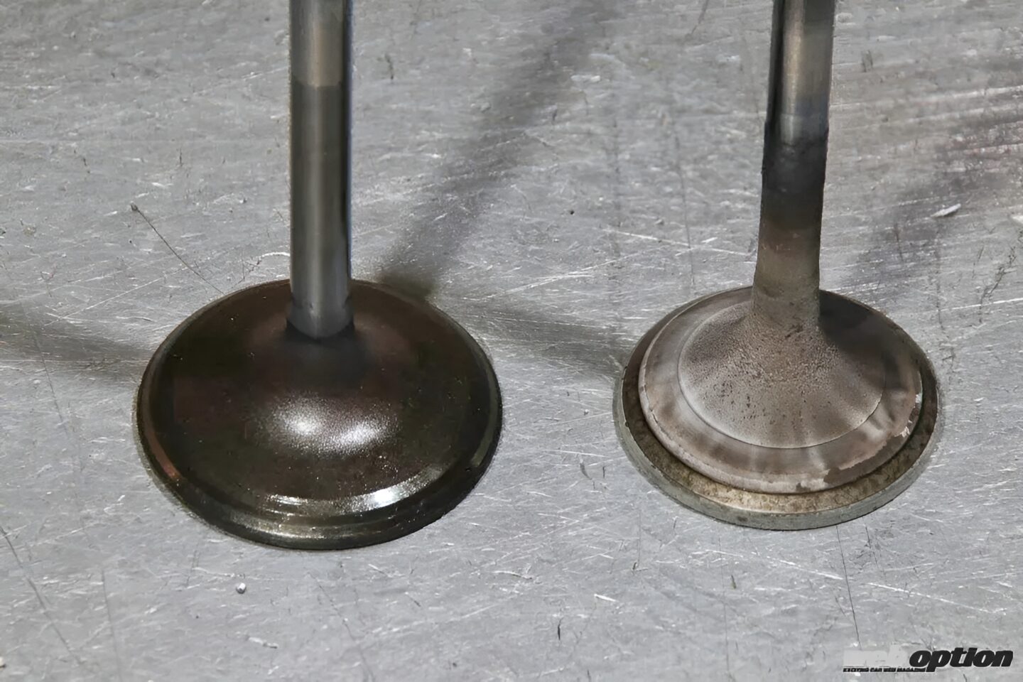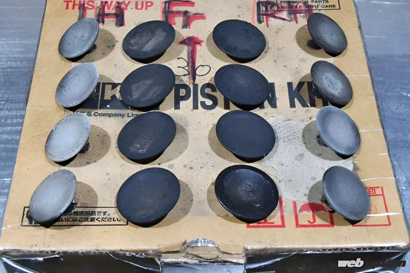 ヘッドの吸排気バルブもご覧の通りで、カーボンの蓄積はあったものの、ステムの曲がりもなく洗浄すれば再使用できるレベル。AT仕様を考慮して、新エンジンではGRB型WRX STIのノーマルカムを組み込んで、トルク重視のセッティングを目指していくそうだ。