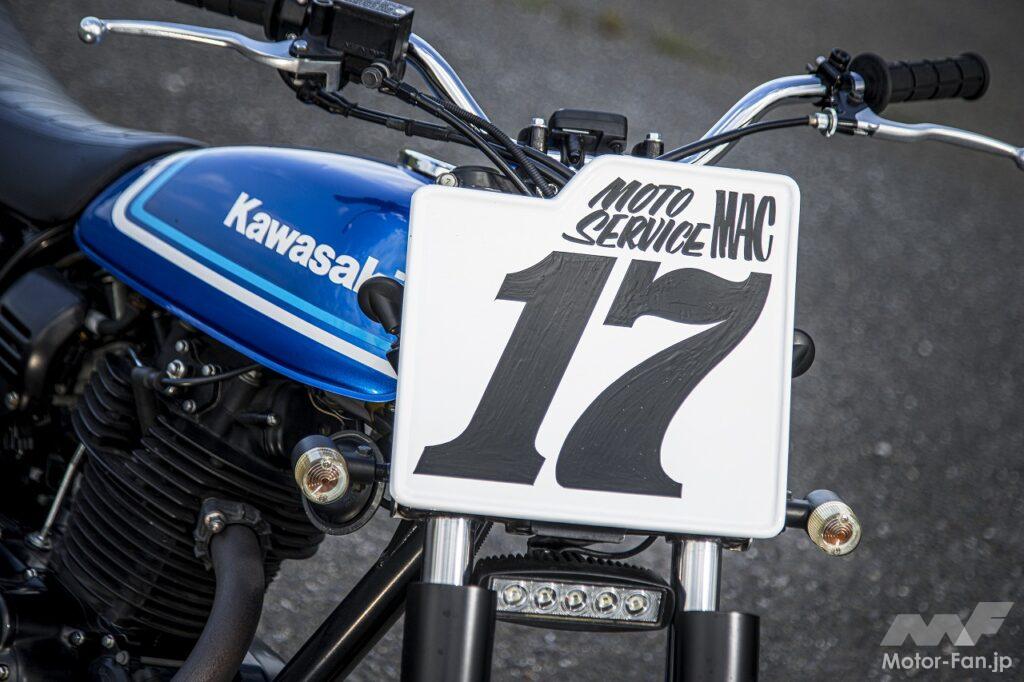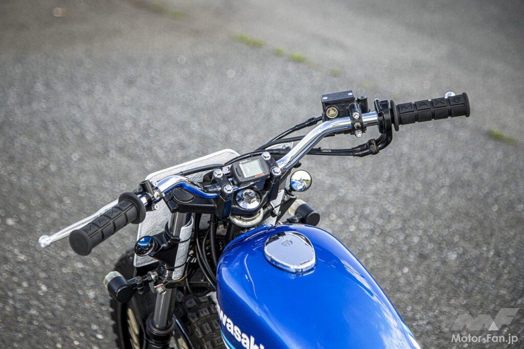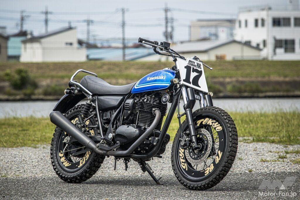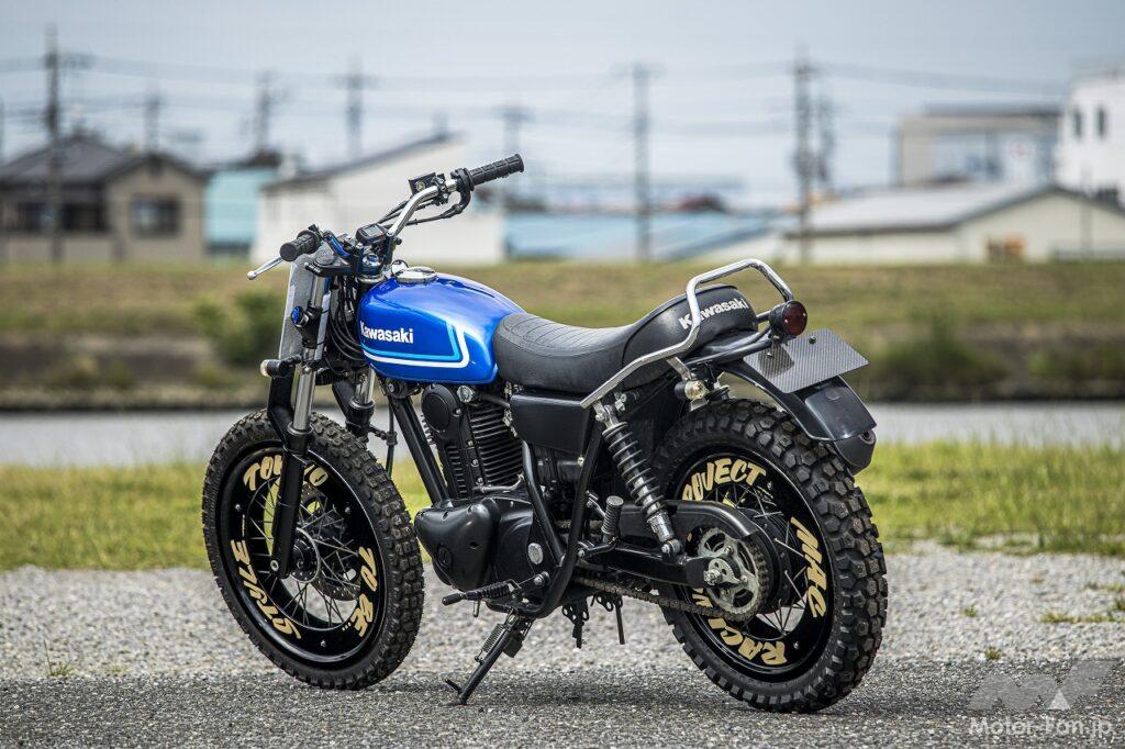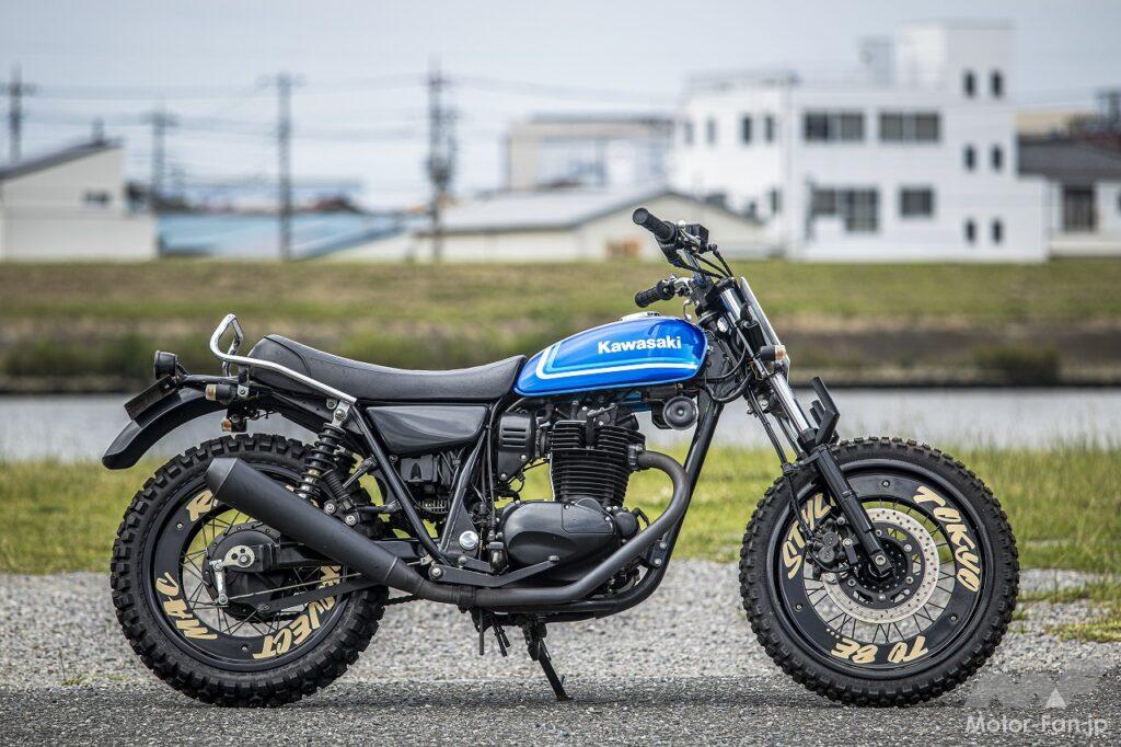さて、今回紹介する「250TR」は、その最中にカワサキがリリースした一台だ。エストレヤをベースに化粧を直し、オンオフ両用のブロックタイヤ(ダンロップTRIALS UNIVERSAL)を組んでビンテージトラッカー風にアレンジした一台。’70年代の2stデュアルパーパスと名を同じくしており、これのリメイクという見方もできる。