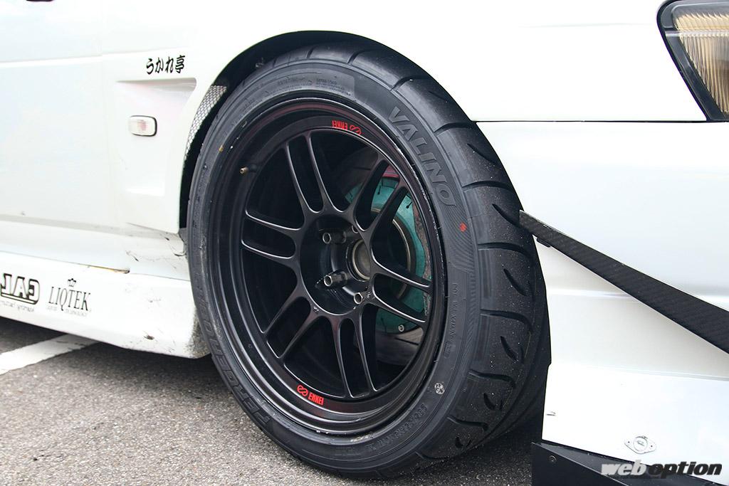 ブレーキは前後ともにプロジェクトミューのキャリパーを装備。ホイールはエンケイRP-F1(10.5J)で、タイヤはシチュエーションに応じて使い分ける。取材時は輸入ハイグリップラジアルのVALINO(285/35-18)を履いていた。
