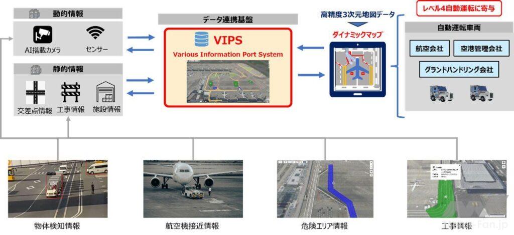 ダイナミックマッププラットフォームは、国土交通省の中小企業イノベーション創出推進事業(SBIR)を通じて空港内情報集約基盤「VIPS」の開発を進めている。VIPS(ビップス)とは、空港内の様々なダイナミックマップ情報※1を集約したデータ連携基盤のことである。