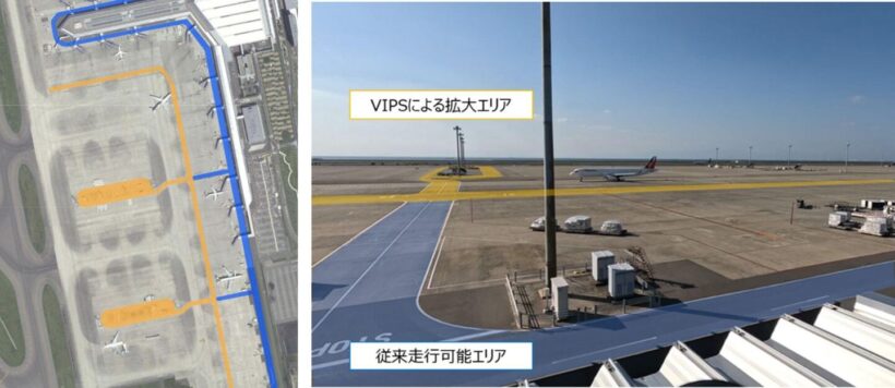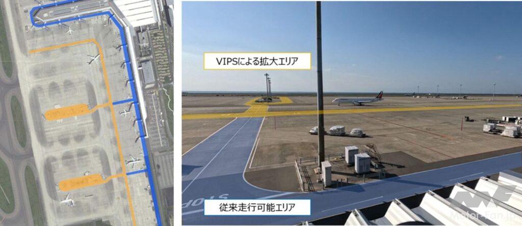 今回の実証ルートには、航空機の走行経路を横断する車両走行路であるサービスレーンが含まれている。サービスレーンでは車載のカメラやセンサのみで航空機の状況を確認することが難しく、レベル4自動運転の実装に課題が残っていた。しかしVIPSを活用すると航空機の位置がリアルタイムで認識できるため、システムによる走行可否判断が可能となる。これまでレベル4自動運転が可能なエリアはターミナル周辺に限られていたが、VIPSを活用することでターミナルから離れた駐機場(沖止めエリア)まで拡大することができる。