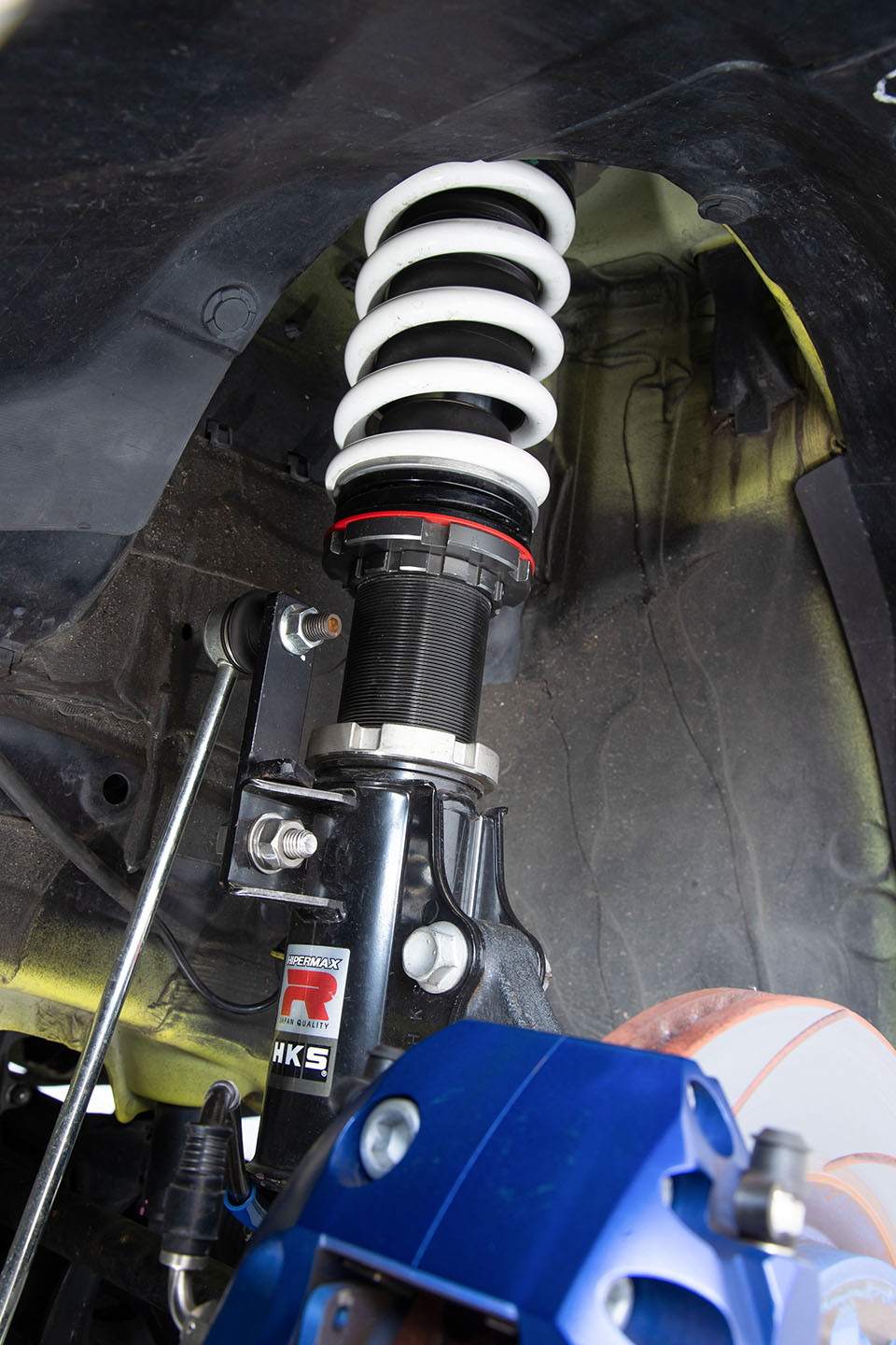 その圧倒的なパワーを支えるため、足まわりも抜かりなく強化。HKSハイパーマックスRにレートアップしたA PITオリジナルスプリングを組み合わせ、筑波サーキットで1分2秒4という好タイムを記録する。