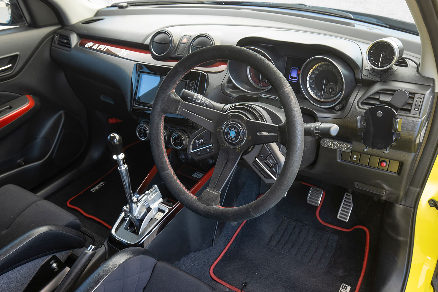 足まわりはテイン・モノレーシング車高調にA PITオリジナルスプリングを組み合わせ、フロントは10〜14kg/mmのダブルレート(中反発)、リヤは12kg/mm(低反発)という構成。街乗りでの快適性とスポーツ走行時の限界性能を高次元で両立している。撮影移動中も、突き上げ感のないしなやかな乗り味が印象的だった。