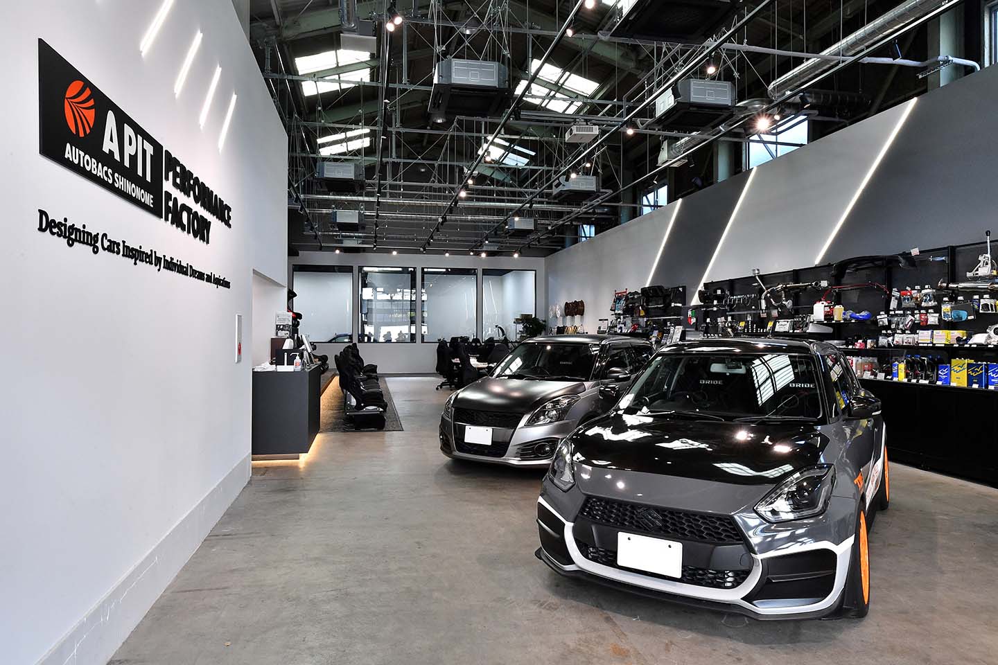 東京・新木場にある「A PIT パフォーマンスファクトリー」は、広々としたショールームを備える専門工房。知識と経験豊富なスタッフが、じっくりとカスタマイズ相談に応じてくれる。足まわり交換やLSD組み込みといった重作業も、最新設備で安心して任せられる。