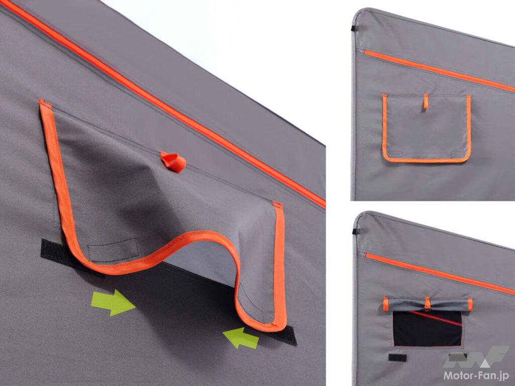 開閉に便利なファスナー式のスクリーンドアを採用。ドアの内側についているスクリーンフックを本体フレームパイプに引っ掛けることで、バイクの出し入れのしやすい広い開口部を確保。