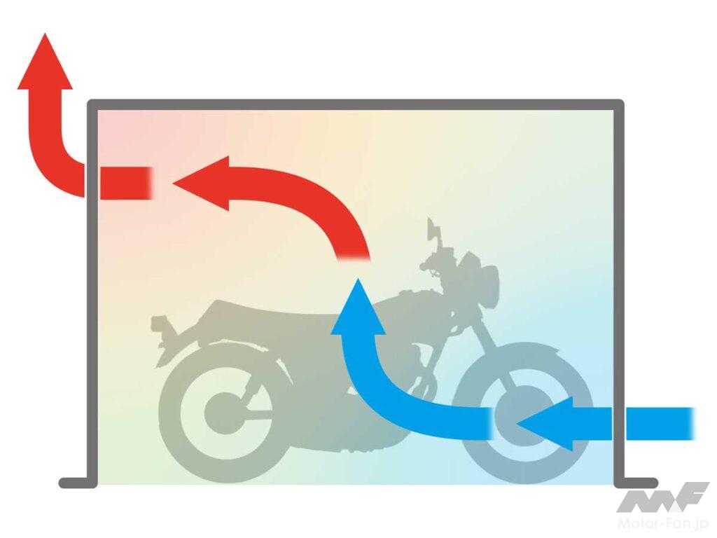 高低差をつけてベンチレーター(換気口)を設置。温度差を利用して、庫内の熱気や湿気を換気。バイクカバーのみの保管に比べて良好なコンディションを保ちやすく、享年劣化の進行も抑制。