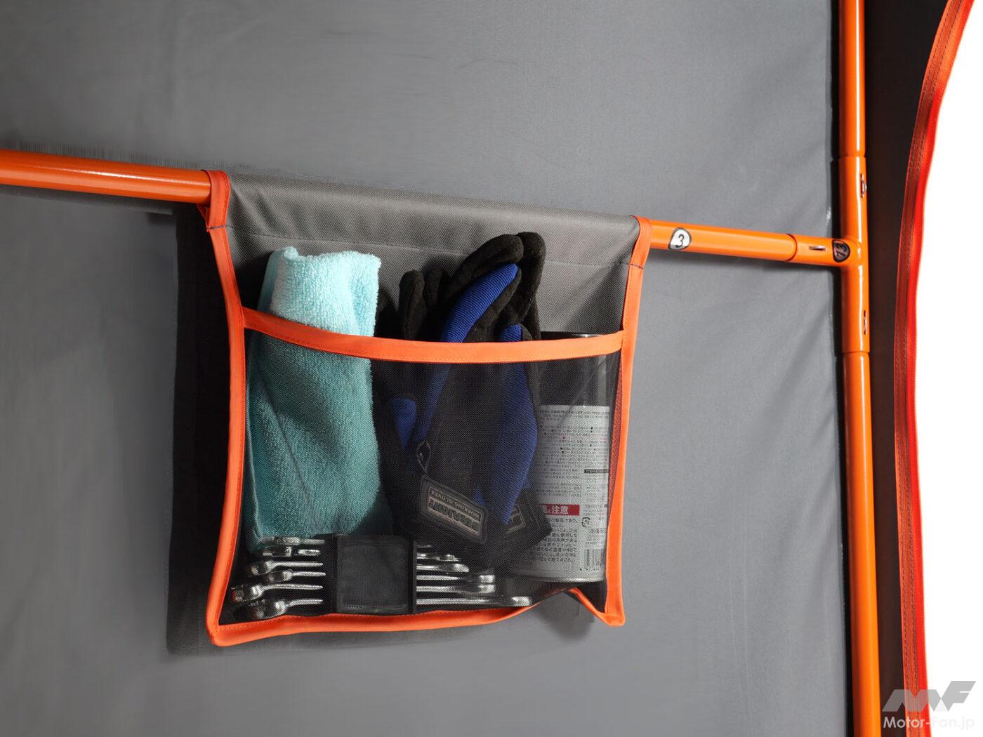 吊り下げ収納袋は任意のパイプに吊り下げ可能。収納袋の前面がメッシュ地になっており、ガレージ庫内でも中身の確認がしやすい。