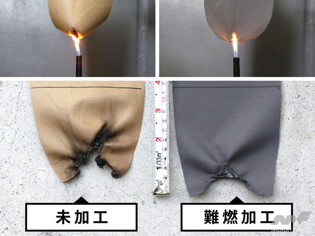 生地カバーはアメリカの難燃性基準「CPAI-84」をクリアする難燃性素材を採用。生地に火がついても自己消火し、燃え広がりを防止。放火や火事によるバイクの損傷を阻止してくれる。