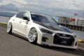 エアロパーツはスカイライン特有のスタイリングを強調しつつ、車高を落とした際にボトムラインが美しく整うようにデザイン。フロントは後期モデルのVモーショングリルを撤廃し、大幅なイメージチェンジを慣行。R35GT-Rのエッセンスを取り入れたディフューザーを組み合わせ、精悍でスポーティな顔付きを演出する。