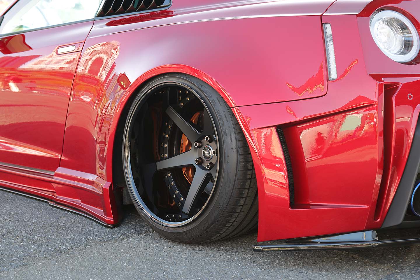 ワイドボディ化によって実現したワイドリムホイールも見どころのひとつ。リヤには12.5Jという極太リムを確保し、ディスクとリムはブラックで統一。そこにゴールドピアスをアクセントとして配している。