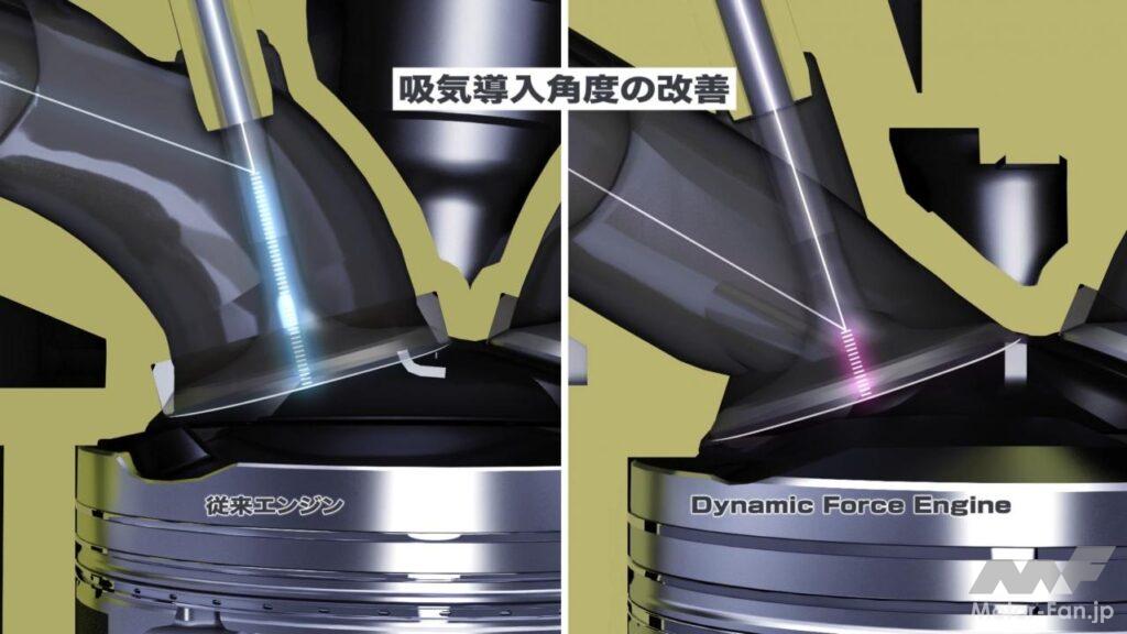 ちなみに、トヨタはA25A-FXS登場時に「バルブ挟角拡大」というアナウンスをしている。熱効率向上のためにはS/V比を小さくすることが求められ、だからバルブ挟角は小さくして燃焼室を形成するのが常道では……などと思ったが、よくよく聞けば吸気ポートを鋭角にしたから挟角が大きくなったということだった——という具合に困惑したのを記憶している。