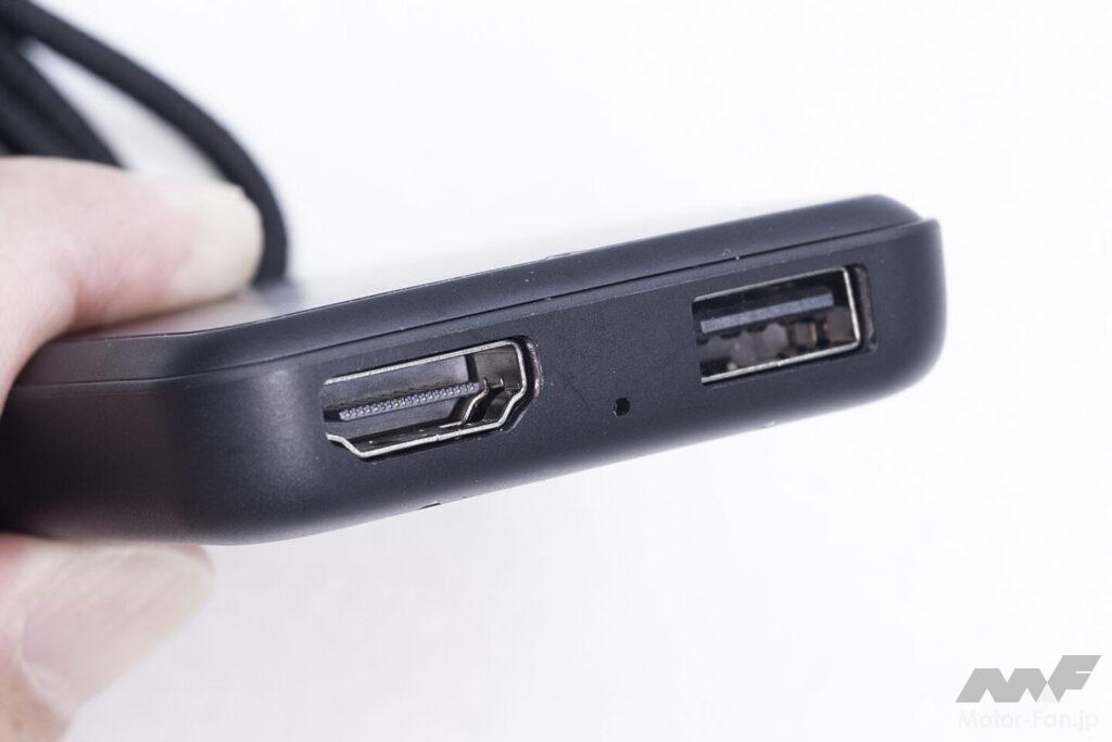 本体にはHDMI端子とUSBタイプA端子を備えている。HDMI端子は一般的なサイズで市販の機器やケーブルの接続が可能で、USBタイプA端子は補助電源として使用できる。