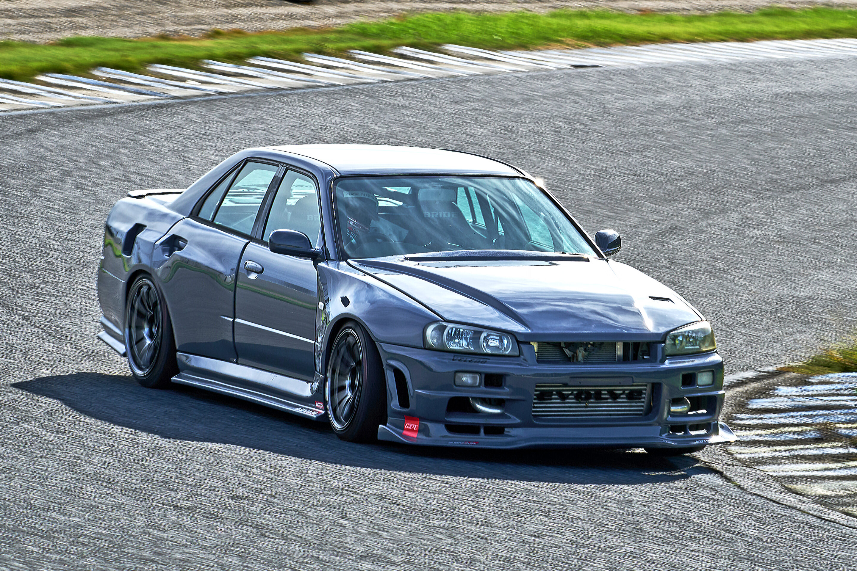 このように、数々のスカイラインを所有するマニアをも満足させるHR改ER34ワイドボディ仕様。ボリューム感あふれる4ドアのレーシースタイルから繰り出されるハイスピードドリフトは、周囲の視線を釘付けにして離さない。