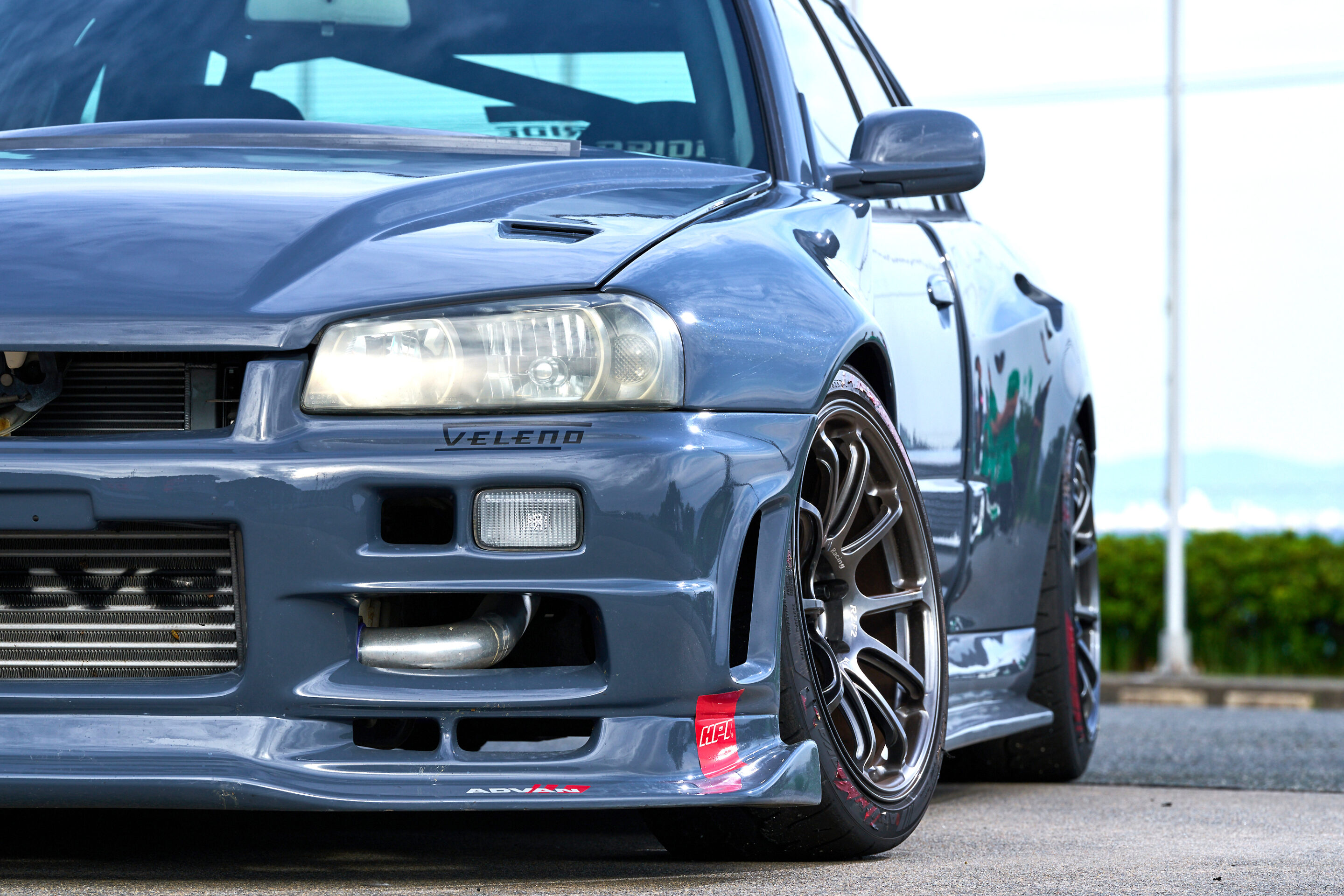 そうした経緯からベース車両となるHR34を見つけ、C35から乗り換えてチューニングを開始。当初はトレーニング優先で、URASのボディキットを装着しつつも、ややワイドに留めた仕様でセットアップしていた。ボディカラーも色褪せた純正ソリッドホワイトのままだったが、企画で大湯都史樹選手とのドリフト対決が決まり、急遽スタイリングの大幅変更に着手することになった。