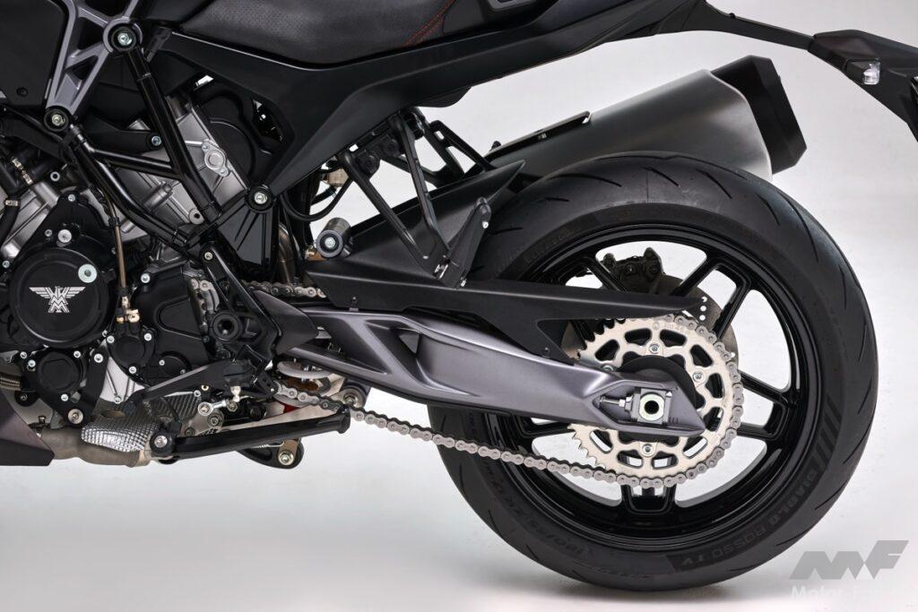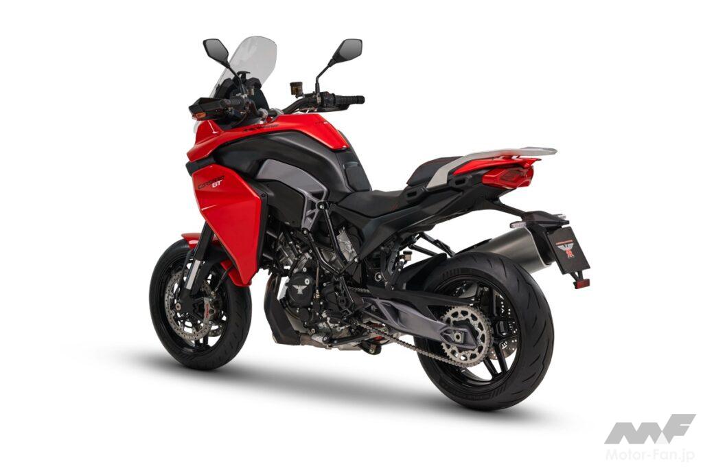Corsaro GTの車体は、スチールとアルミを組み合わせたミックスフレームを採用し、ねじり剛性と軽量性を両立している。フロントサスペンションには完全調整式倒立フォークを装備し、リアはプログレッシブリンク式モノショックを組み合わせることで、路面状況に応じてしなやかに動く足まわりを実現している。これにより、高速コーナーでの安定性や荒れた舗装路での追従性といった、ツーリングに求められる要素を高いレベルで成立させている。