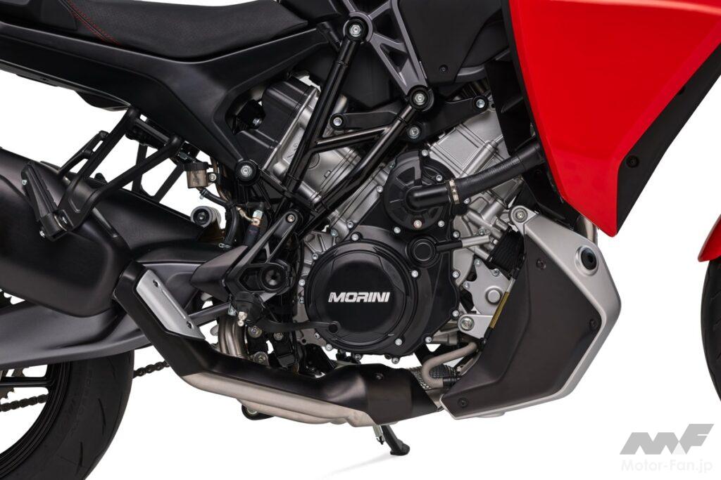 Corsaro GTの動力源となるのは、749ccの90度Vツインエンジンだ。このエンジンはMoto Moriniの伝統を受け継ぎつつ、現代の性能要求に応えるべく最適化された水冷4ストロークユニットである。最大出力は約96馬力、最大トルクは約77Nm を発揮し、必要十分なパワーを持つまさにスポーツツアラー向けの性能を備えている。Euro 5+ 規制に対応し、効率と環境性能も高いレベルで両立させている。