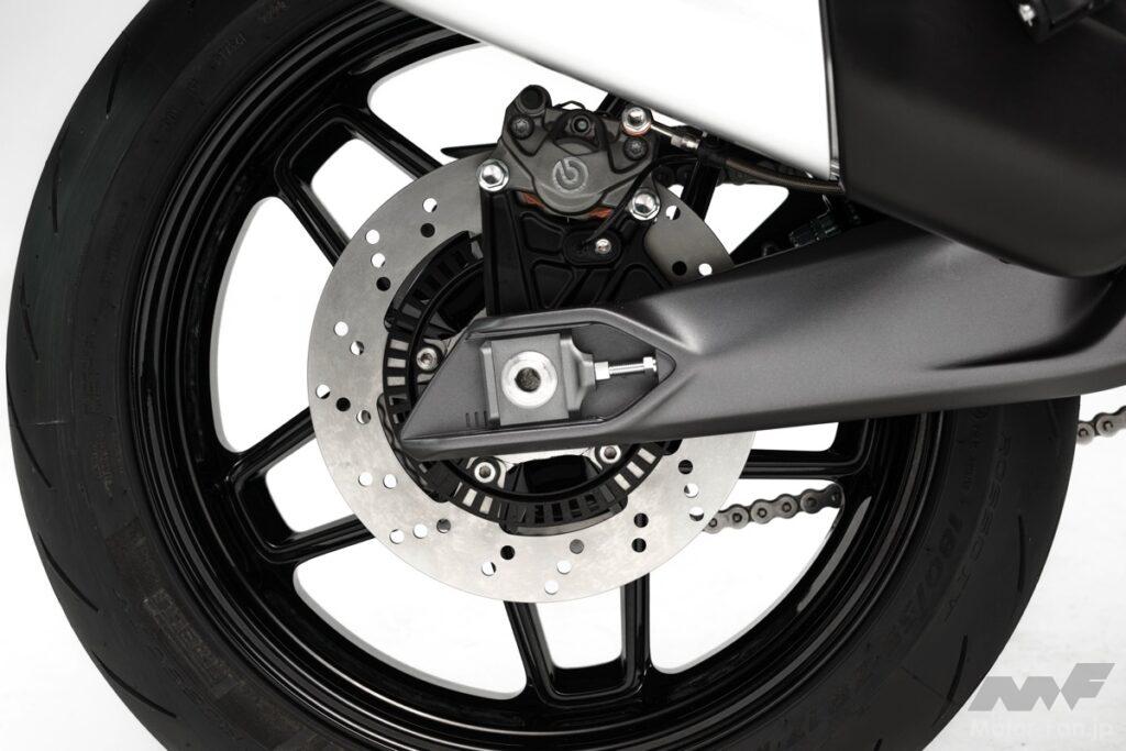 ブレーキはBrembo製モノブロックキャリパーと大型320mm ィスクを前輪に、255mmディスクを後輪に配置し、ツーリング時やスポーツ走行時でも確実な制動力とコントロール性を提供する。ABS はコーナリング対応の電子制御となり、ライダーの操作を妨げずに安全性を高める役割を果たす。