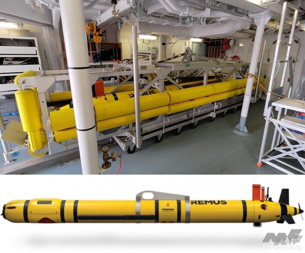 あわじ型掃海艦に搭載されている機雷捜索用水中無人機「OZZ-4」。全長は3.25m。魚雷のような胴体の側面に合成開口ソナーを備え、高精度な探索能力を持つ(写真/筆者、CG/Hydroid)