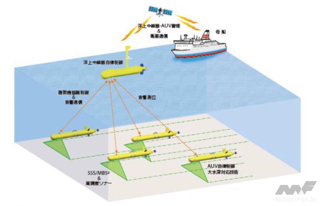水中無人機の管制に関してIHIが公開した資料に掲載されたイラスト。有人艦と連携する水上無人機が中継役となり、複数の水中無人機を従えている。今回公開された水中防衛用小型UUVも、遠隔管制式であるとすればこうした技術が活用されることになるだろう(イラスト/IHI)