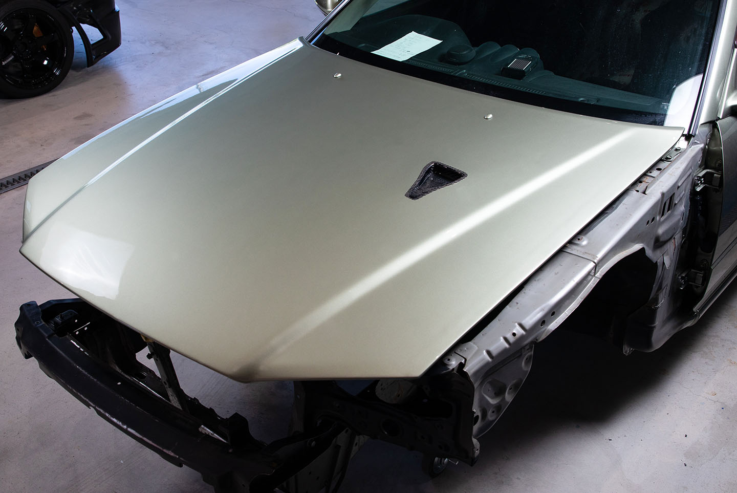 ボンネットは純正キャッチを使用できる強度と軽量性を両立。塗装前提となるため表面はFRP、裏面のみをカーボンとしたハイブリッドタイプ(23万6000円)も設定されている。もちろん、コストを抑えたFRPタイプ(14万3000円)もラインナップ済みだ。