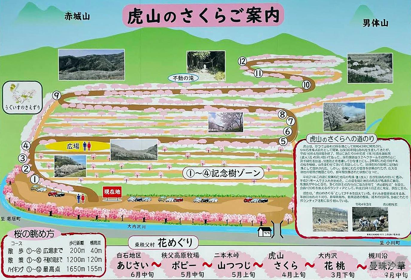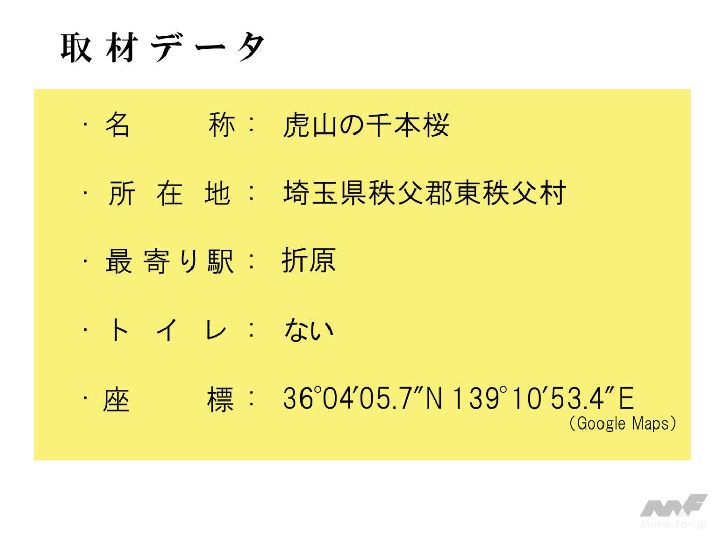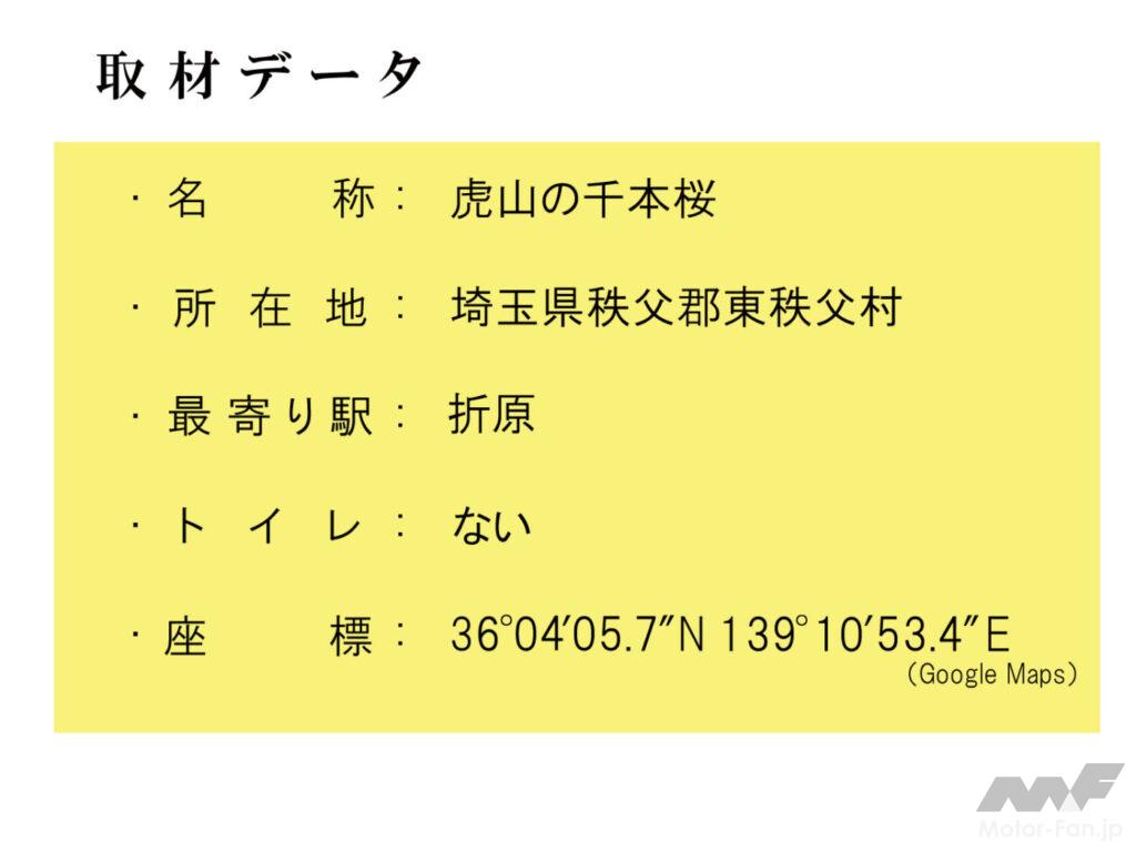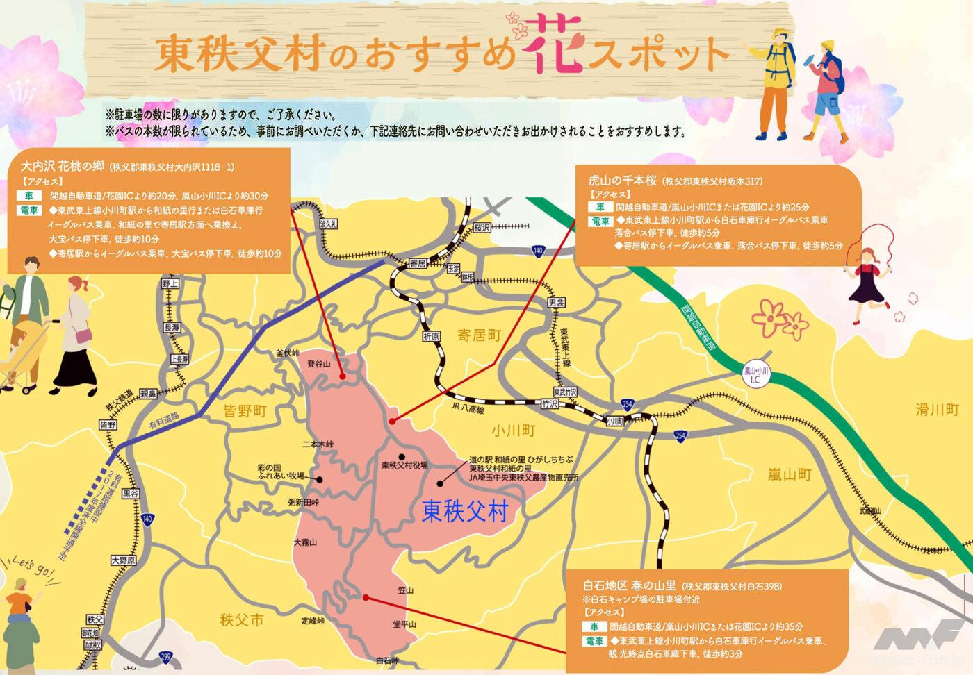 ちなみに関越自動車道の嵐山・小川インターチェンジ、あるいは花園インターチェンジから15Km(車で25分)ほどの距離です。駐車場に常設トイレはありません。ただ花見シーズン中は仮設トイレが設置されるもよう。また県道294号線を500m(車で1分)ほど北上した「堂平バス停」には駐車場と公衆トイレが、逆に南下し県道11号を行くと約3km(車で約4分)で道の駅「和紙の里ひがしちちぶ」が利用できます。
