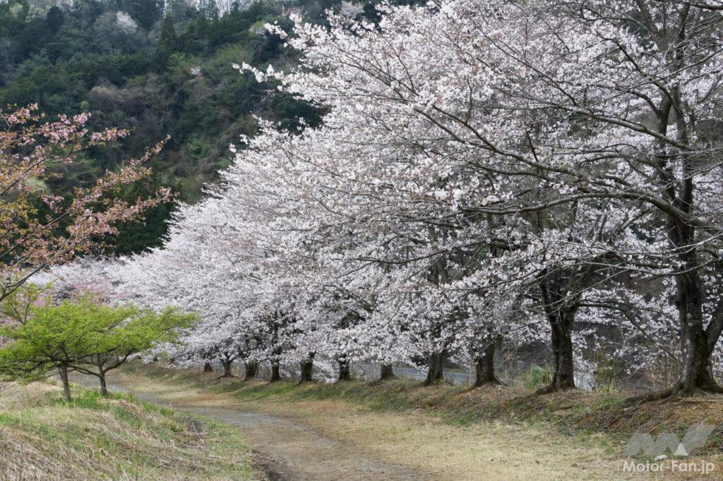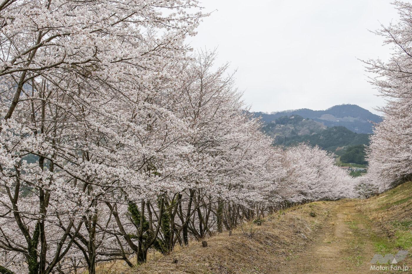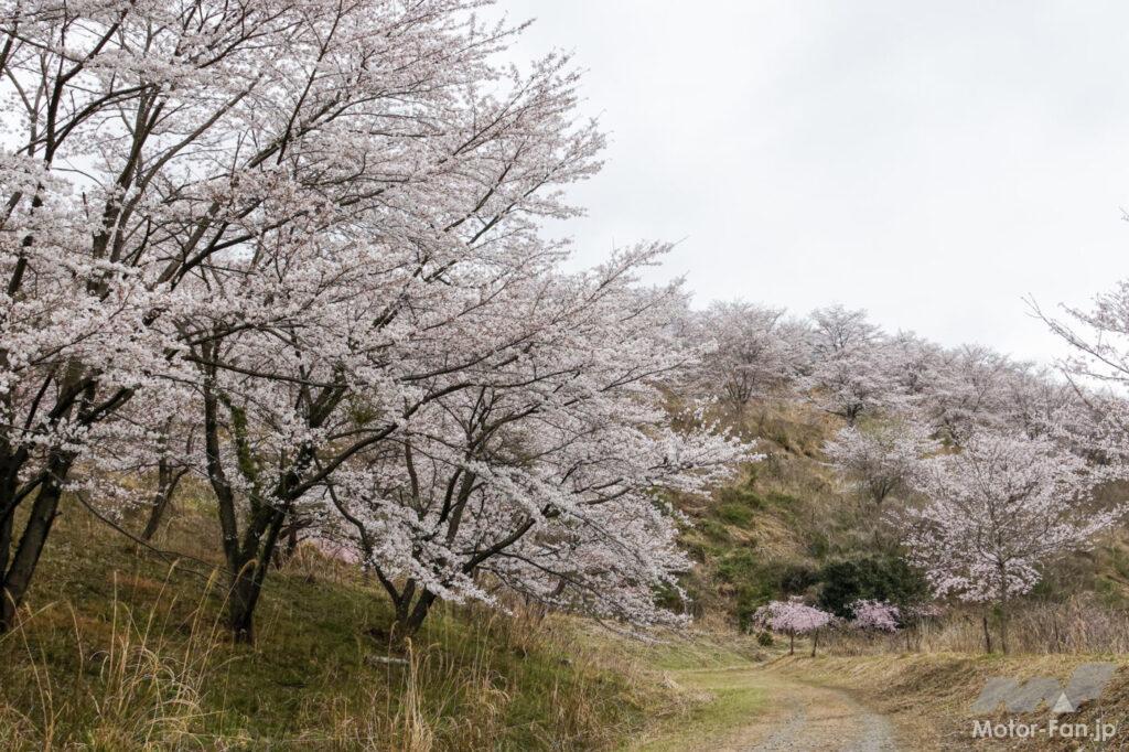 傾斜地に雛壇のように広がる桜づくしの光景は圧巻。プチハイキング気分で楽しむのにちょうど良いロケーションです。駐車場から散歩気分で行ける広場までは200m程度ですが既に標高差は40m。奥にある不動の滝までは1,200m。さらに奥の最高地点までは1,650mの距離で、155mの標高差があります。