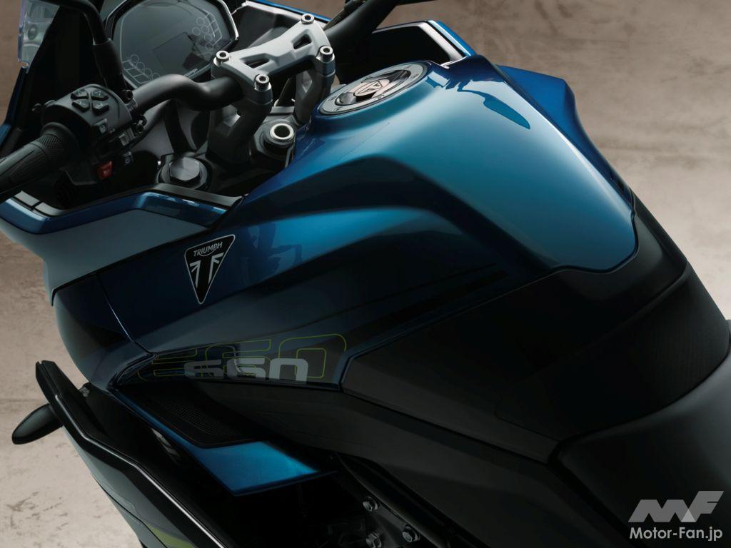 メーターは、カラ―TFTディスプレイとLCDスクリーンの組み合わせ構成を採用し、視認性に優れた分かりやすい情報表示を実現している。MyTriumphコネクティビティを標準装備し、ターンbyターンナビゲーション、音楽操作、通話コントロールが可能だ。また、新デザインのDRL一体型ヘッドライトを含むフルLED灯火類により、優れた被視認性と、ひと目でトライアンフと分かる個性的なルックスを両立している。