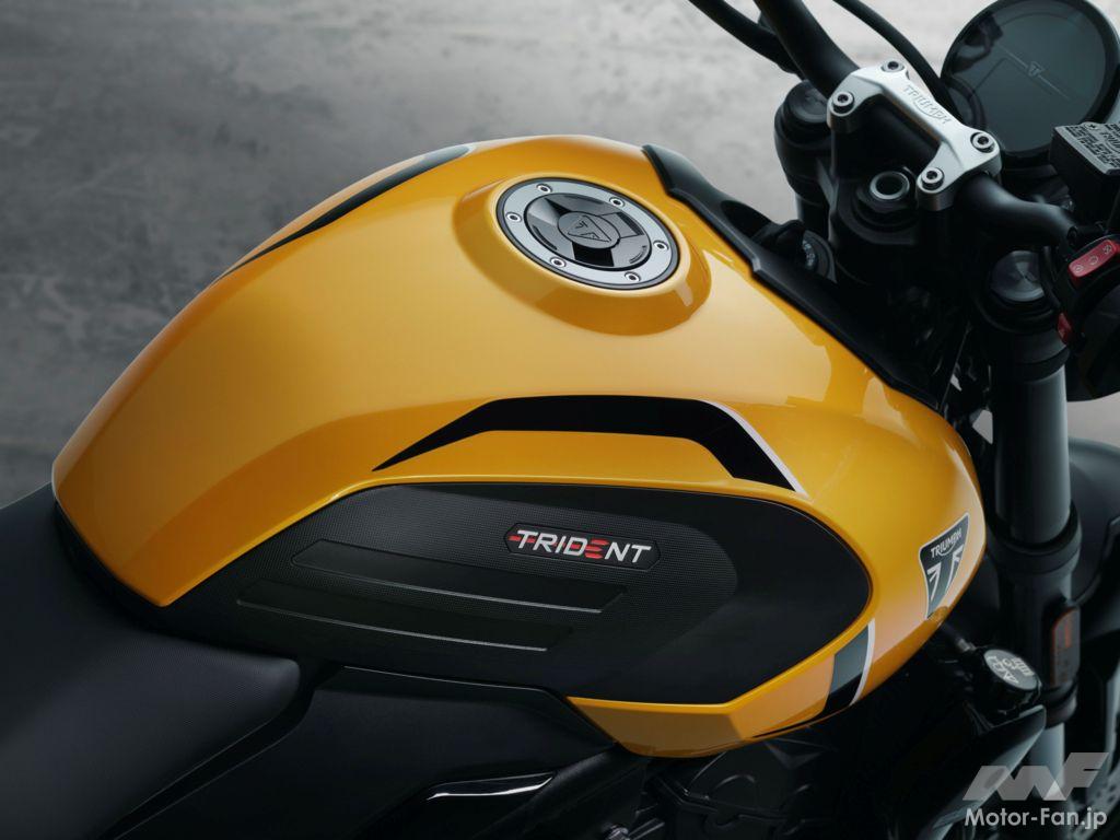 コズミックイエローとストーングレーの2色をプレミアムカラーとして設定し、スタンダードカラーにはスノードニアホワイトを用意。いずれのカラーも、Tridentのモダン・ロードスターとしてのアイデンティティを際立たせる、特徴的なグラフィックが施されている。