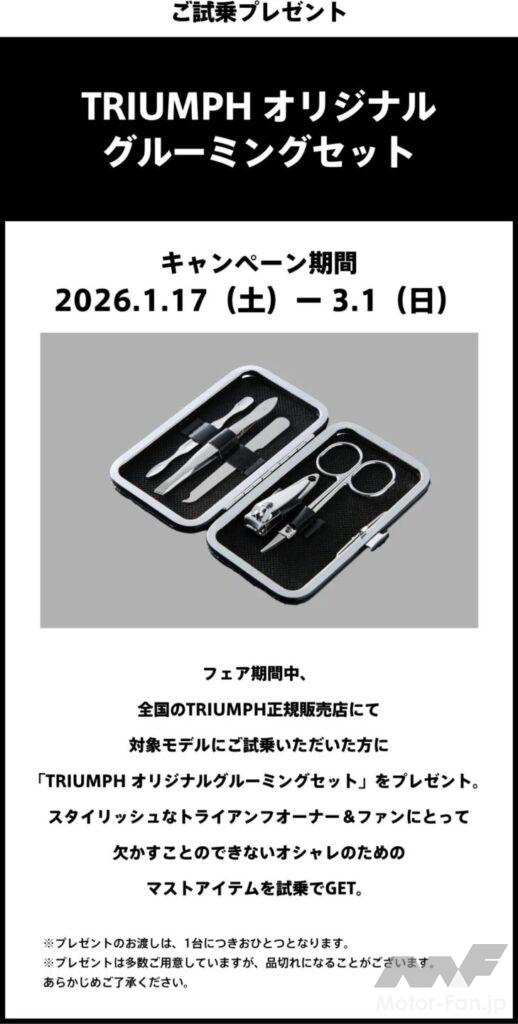 トライアンフモーターサイクルズジャパンが1月17日〜3月1日まで全国トライアンフ正規販売店で「モダンクラシックフェア」を開催中。新型Bonneville T100/T120/Bobber/SpeedmasterやScrambler 900/1200XEなど最新モダンクラシックシリーズを体感できる機会として、多くのファン注目のイベントとなっている。試乗した来場者にはオリジナルのグルーミングキットをプレゼントする特典も用意されており、新たなクラシックモデルの魅力を堪能する絶好のチャンスだ。