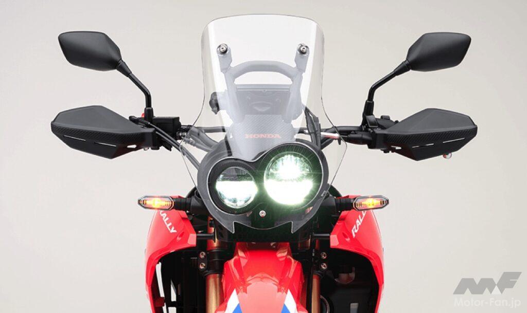 CRF250 RALLYは、ダカールラリー参戦マシン「CRF450 RALLY」のフォルムを彷彿とさせるアドベンチャーモデル。フロントスクリーンやフレームマウントのヘッドランプ、メーターを装備し、高速クルージング時の快適性を追求。