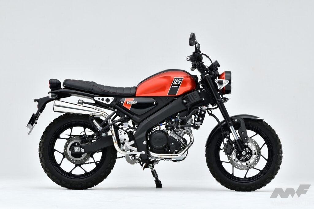 XSR125の印象を大きく変える、新設計のショートメガホンサイレンサーを採用。アップマウントサイレンサーにすることでスクランブラーフォルムを演出。