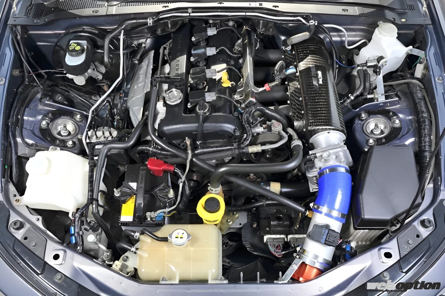 スロットルは、RX-8用と純正(60φ)を合体させた70φ大口径タイプをインストール。ドライカーボン製サージタンクはワンオフのインマニを介してドッキングされる。制御はECU-TEKが担い、アクセル全開のままシフトアップできるフラットシフトやオートブリッピング機能も実装している。