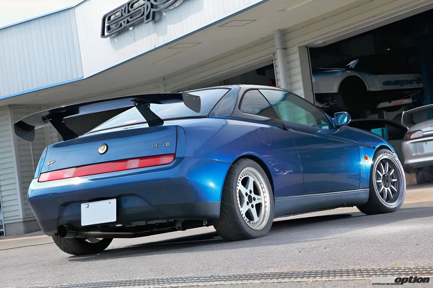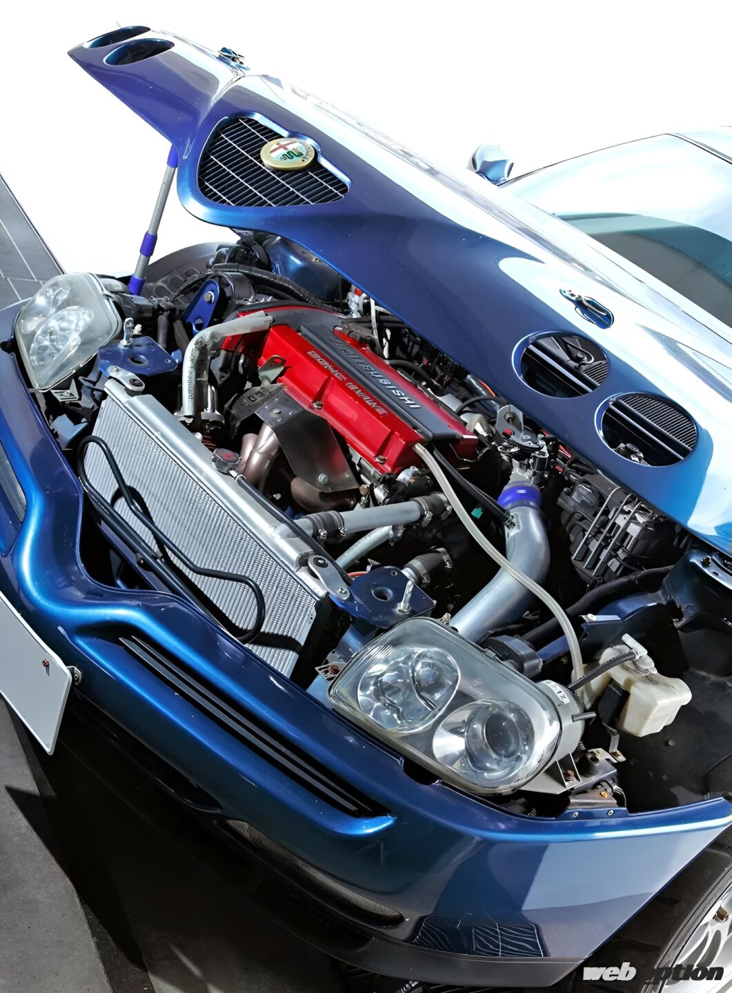 そんなアルファGTVをベースにしたスーパーチューンドがこちら。何と心臓部には、HKSのキットで2.3Lまで排気量を拡大した4G63ユニットが鎮座しているのだ。