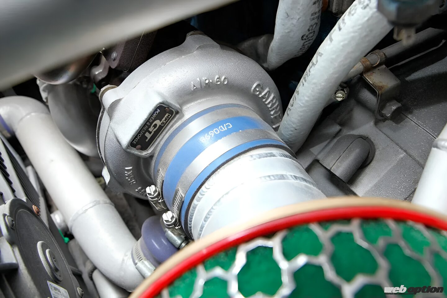 ヘッドにはHKSカムシャフトが組まれ、強化ポンプや850ccインジェクターで燃料系の強化も敢行。そこにセットされるタービンはHKS GT3037。制御系はエンジンハーネスを製作した上でF-CON Vプロが導入され、最大ブースト圧1.5キロ時に480psを発揮する。