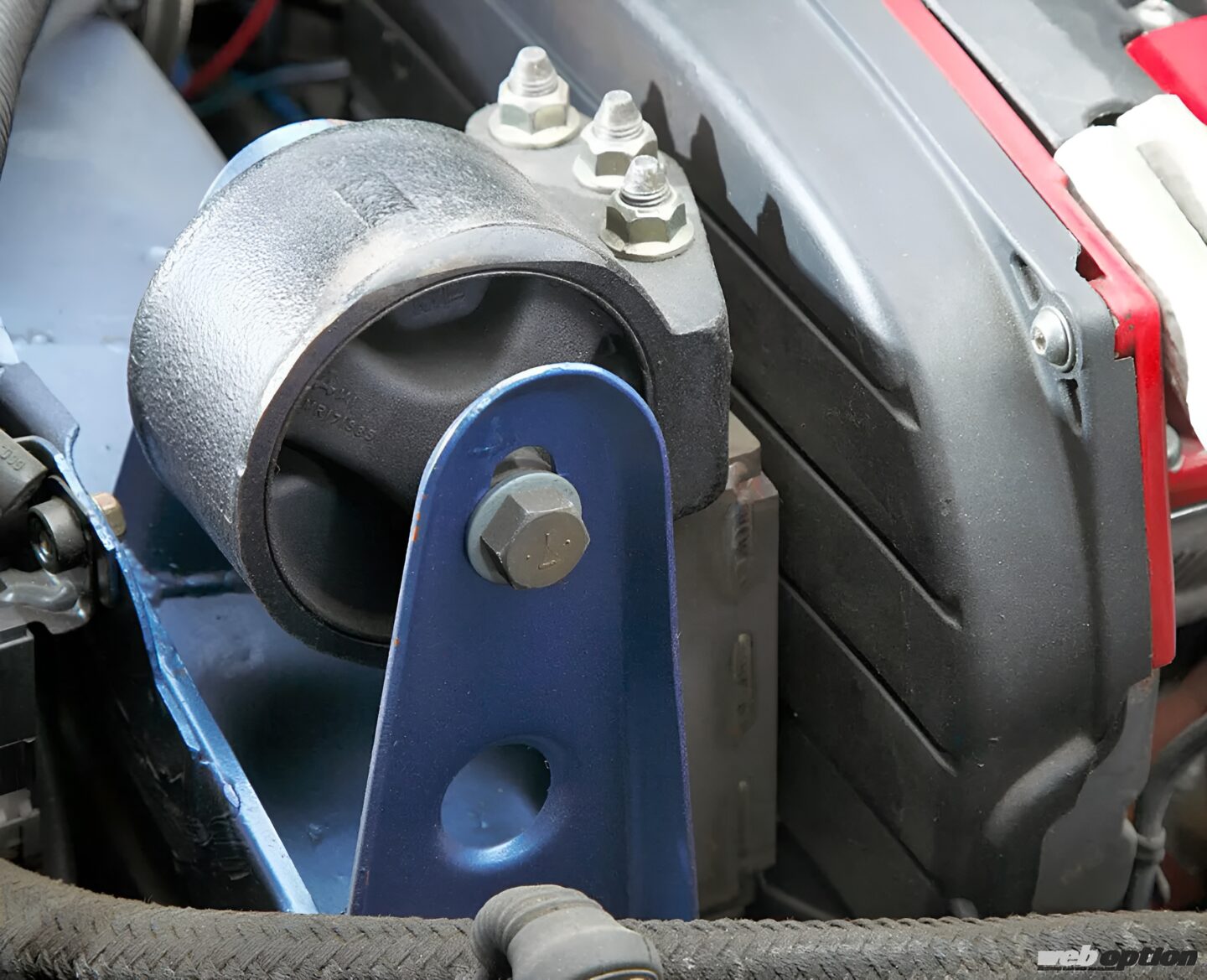 エンジン&ミッションマウントは現車合わせのワンオフ。ちなみにミッションもランエボ用の5速が搭載されているが、リヤに駆動トルクを伝達する必要がなく、FF用として使うため、内部に加工が施されている。もちろんドライブシャフトもワンオフだ。