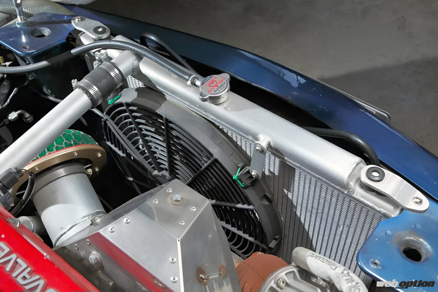 ラジエターはコア面積をできる限り広く取ったアルミ製ワンオフ品。大型電動ファンも追加して、フルチューン4G63の性能を安定発揮させるクーリング性能を手に入れている。