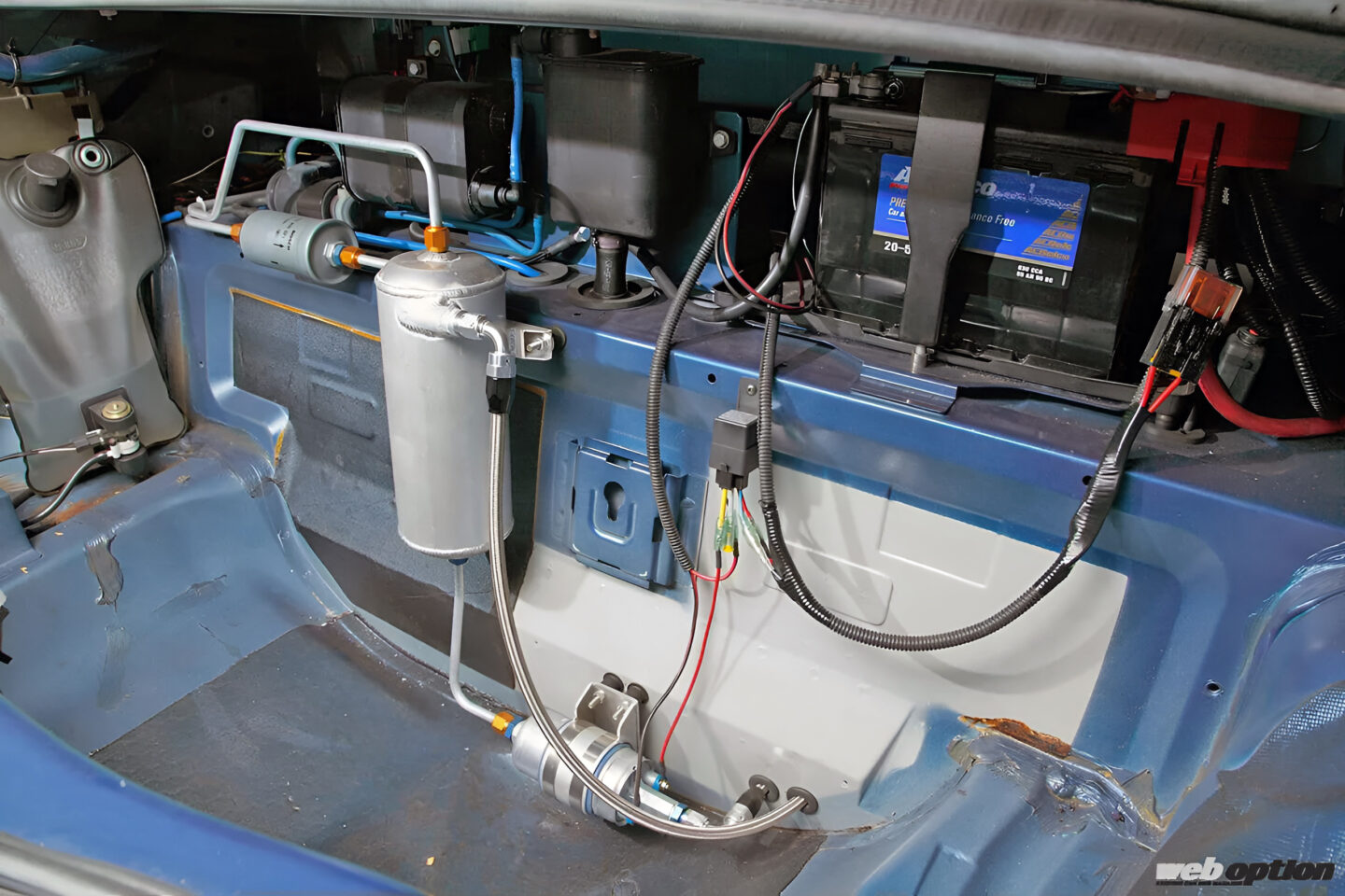 トランクルームにコレクタータンクをセット。燃料ポンプは純正タンクからコレクタータンク、コレクタータンクからエンジンに送る2基が備わる。いずれもボッシュ製だ。