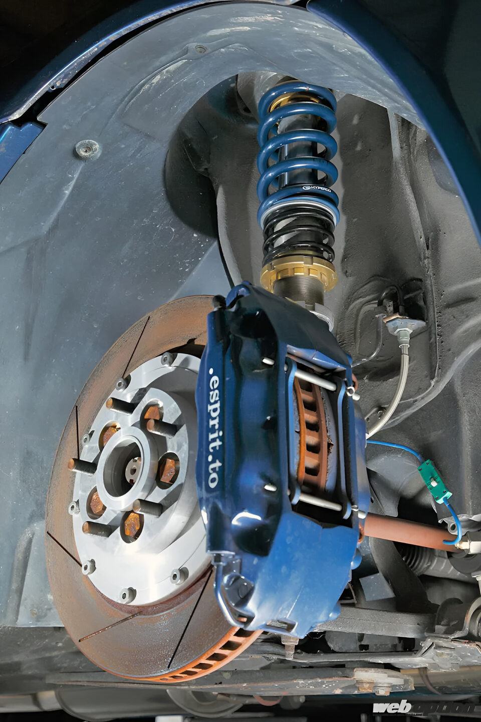 足回りも徹底的にモディファイ。フロントは、アルファGTVのシェルケースを加工してHKSのCZ4A用車高調を装着。スプリングはハイパコ製が組み合わされる。