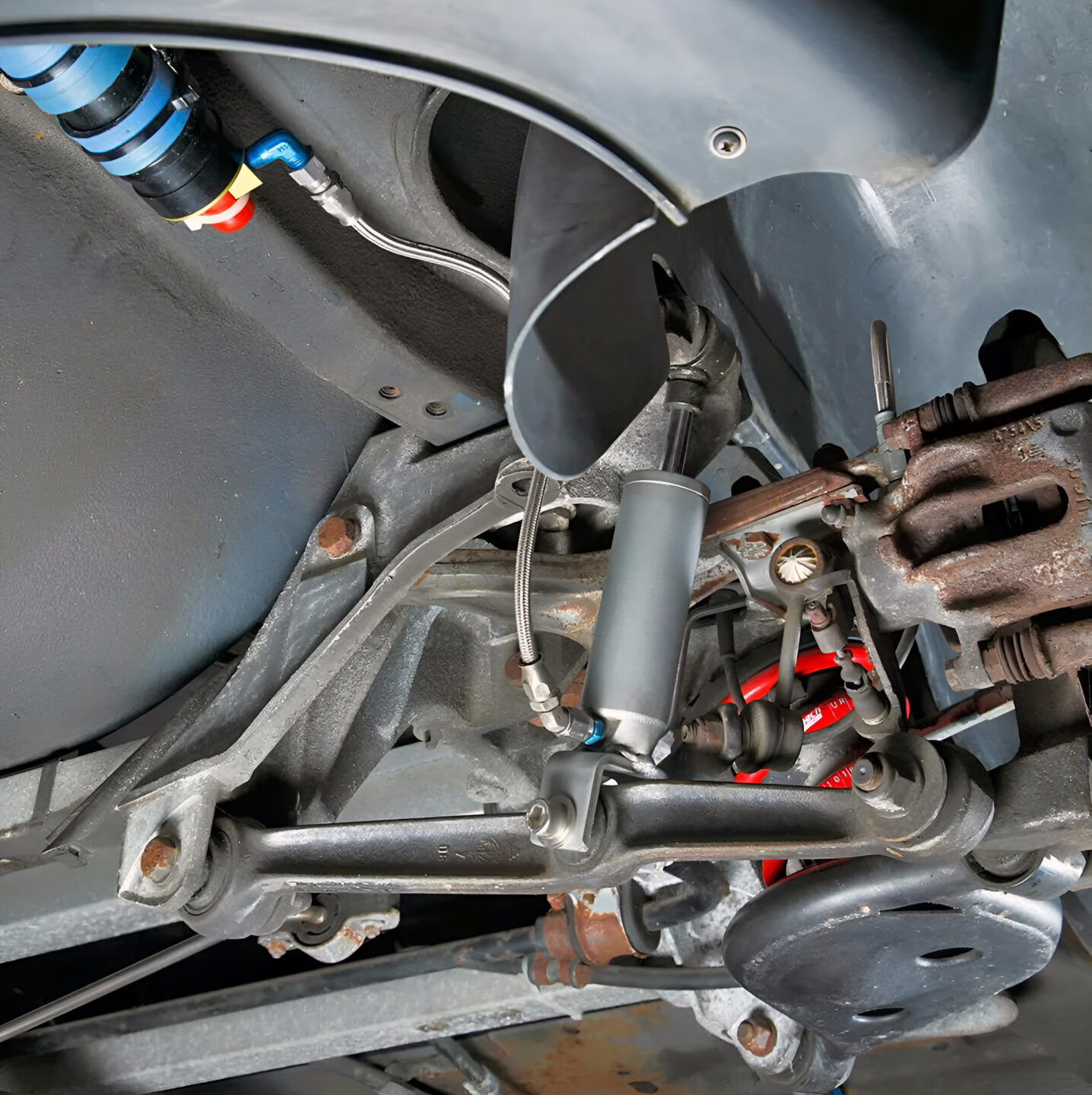 リヤは取り付け形状の問題をクリアしながら、目標とする車高ダウン量とストローク量を確保するためにワンオフ製作。ダンパーは十分な容量も確保するため、別タンク式が装着される。