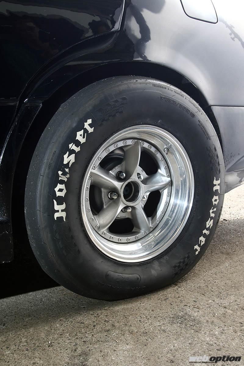 現在リヤタイヤは、フージャーのDR2ドラッグラジアル(P325/50R15)を使用。ホイールは定番のパナスポーツG7-C5Rが選ばれている。