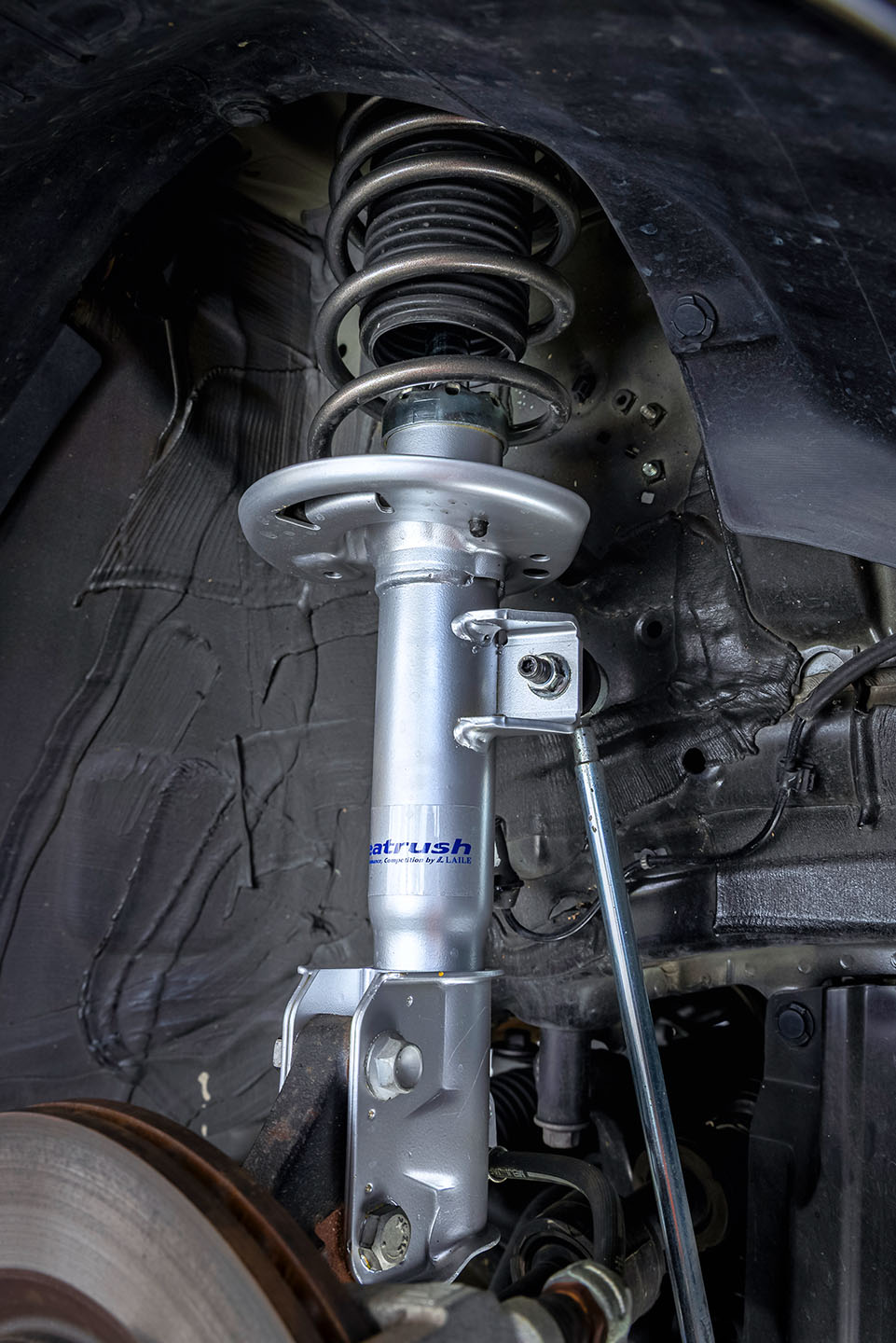 ベースとなるのはKYBローファースポーツ。減衰力は純正比約15%アップ。フロント固定式、リヤ14段調整式という仕様だ。試乗時には前後とも4kg/mmのスプリングを装着。純正形状はストローク量を確保しやすく、スプリングの当たりも柔らかいという利点がある。コストを抑えやすい反面、スポーツ性能とのバランス取りが難しいが、そこはZC33Sを熟知したレイルのノウハウが活きる部分だ。