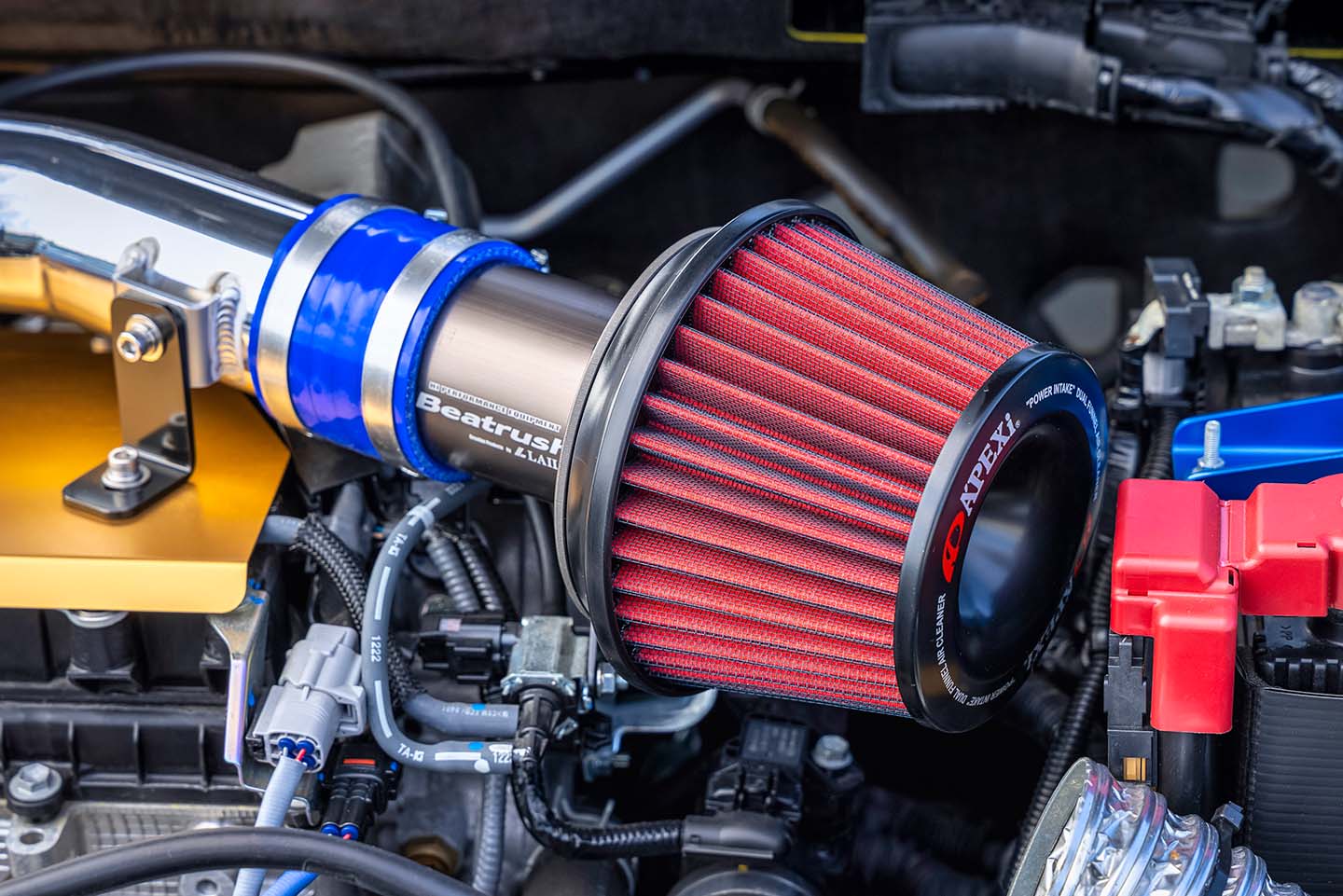 吸気系ではBeatrushインテークキット(10万4500円)を装着。剥き出しタイプのエアクリーナーと専用パイピングのセットで、約7psのパワーアップを実証済み。エアクリーナー位置をエンジンから離すことで吸気温度上昇を抑えている。